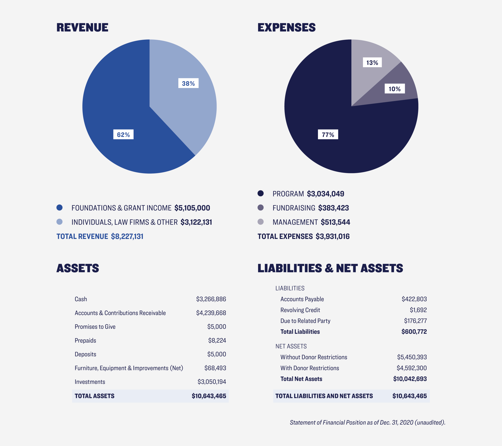 Read MoreGiffords Law Center to Prevent Gun Violence, our 501(c)3 organization, receives funding from individual donors, foundations, law firms, and corporations. In 2020, as in previous years, the majority of our revenue was spent on our efforts to save lives from gun violence through research, legislation, litigation, and community violence intervention strategies. The below financials are limited to Giffords Law Center and do not represent funding or revenue for other Giffords entities.