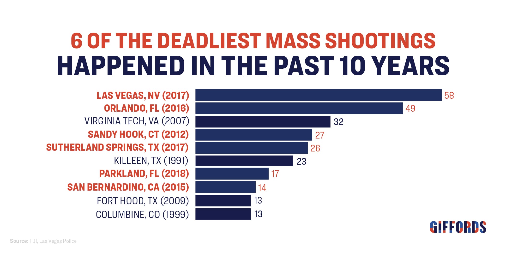 2. Six of the deadliest mass shootings in recent history happened in the last decade.