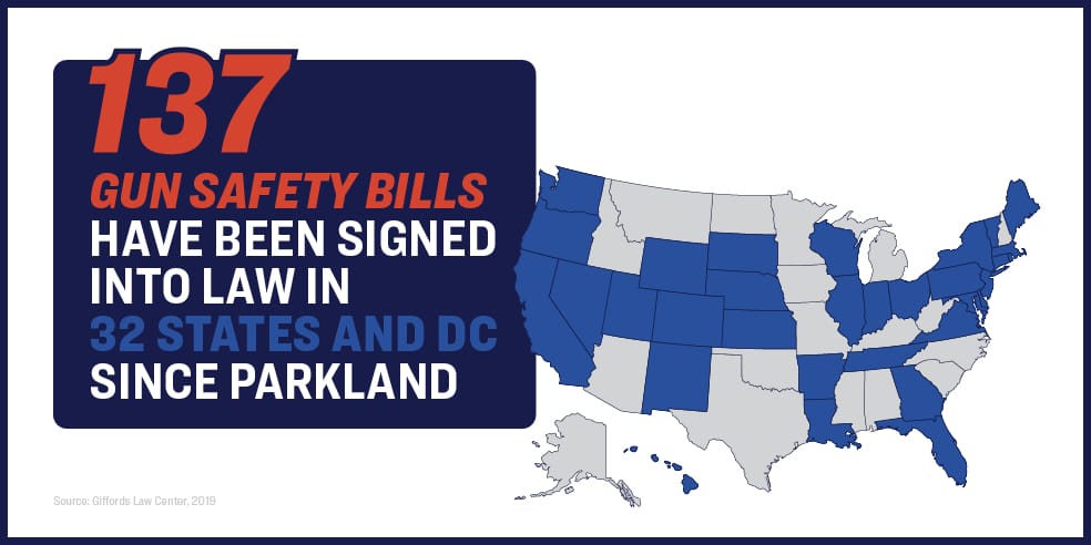 This promising trend is reflective of increasing momentum within the gun safety movement in recent years. In the past 22 months, 32 states and DC have passed 137 bills, including 16 states with Republican governors. In the 2019 state legislative cycle alone, 23 states and DC have signed 70 gun safety bills into law.