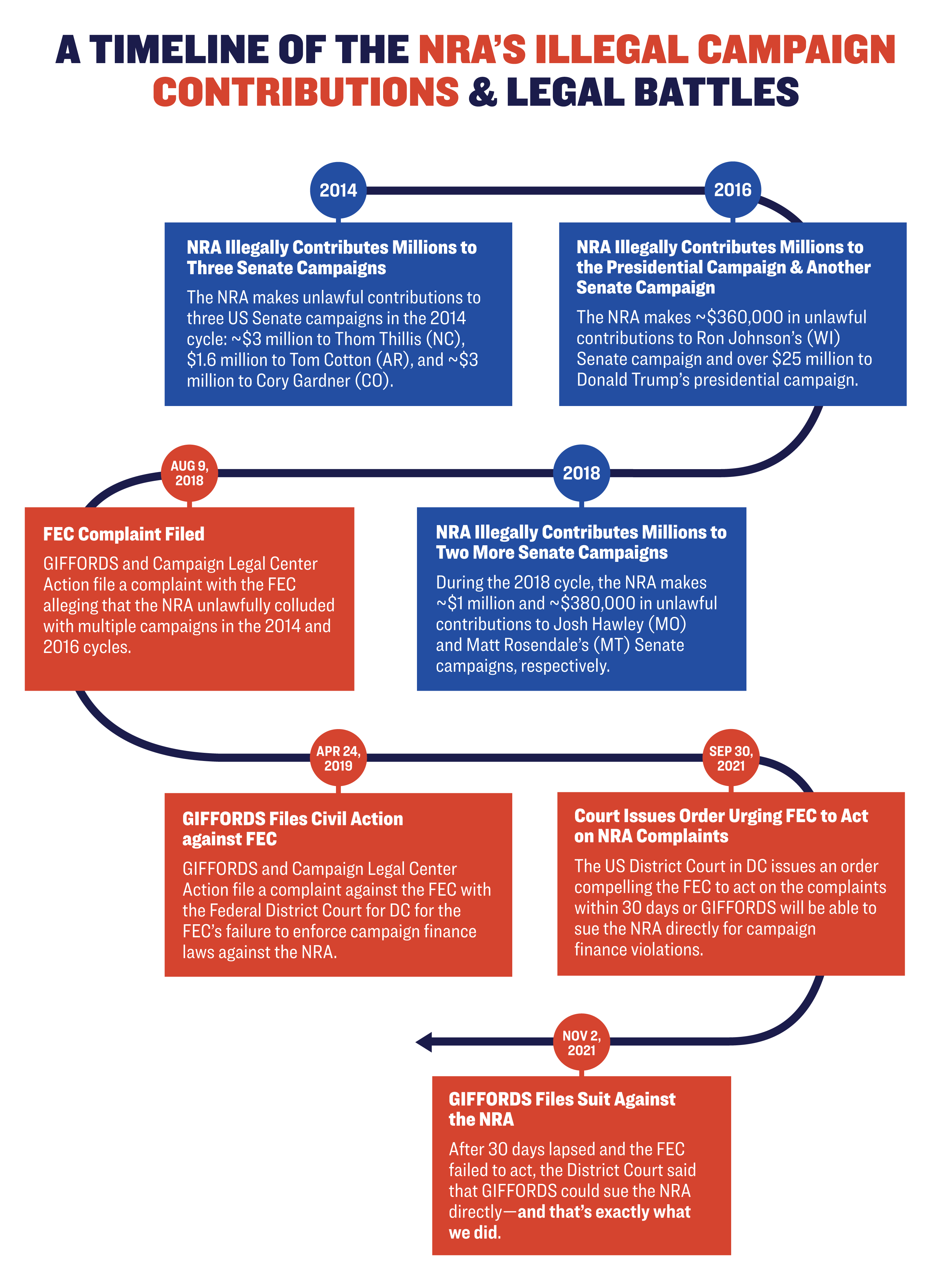 GIFFORDS, represented by Campaign Legal Center Action, is suing the National Rifle Association and its affiliated entities for making as much as $35 million in unlawful, excessive, and unreported in-kind campaign contributions—including to six Senate candidates and Donald Trump’s presidential campaign.
