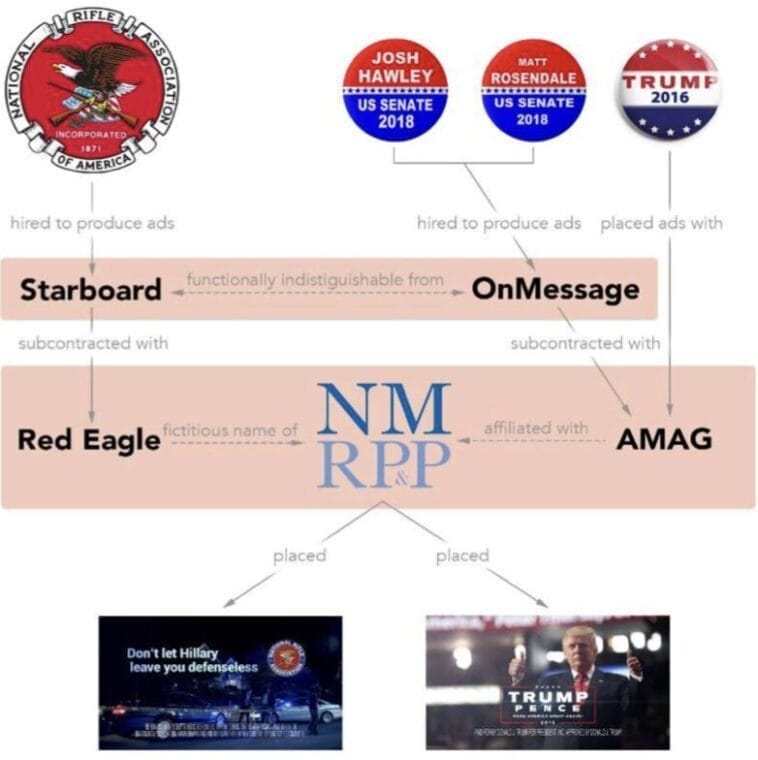 To execute this scheme, the NRA coordinated with the same political consulting firm as these campaigns, using a shell game: one integrated operation with the same employees, address, and internal operations operated under two different names—OnMessage and Starboard—to make it look like they were two separate companies.