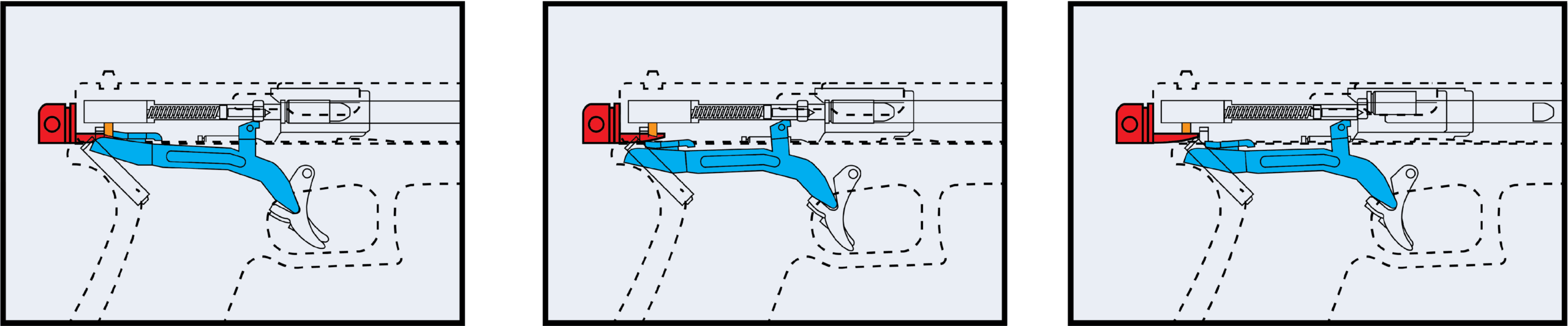 Illustration of a semiautomatic Glock handgun equipped with a switch before the trigger pull (left); following the trigger pull, as the striker and slide move backward with recoil (middle); and as the next bullet fires as the Glock switch holds down the trigger bar (right).