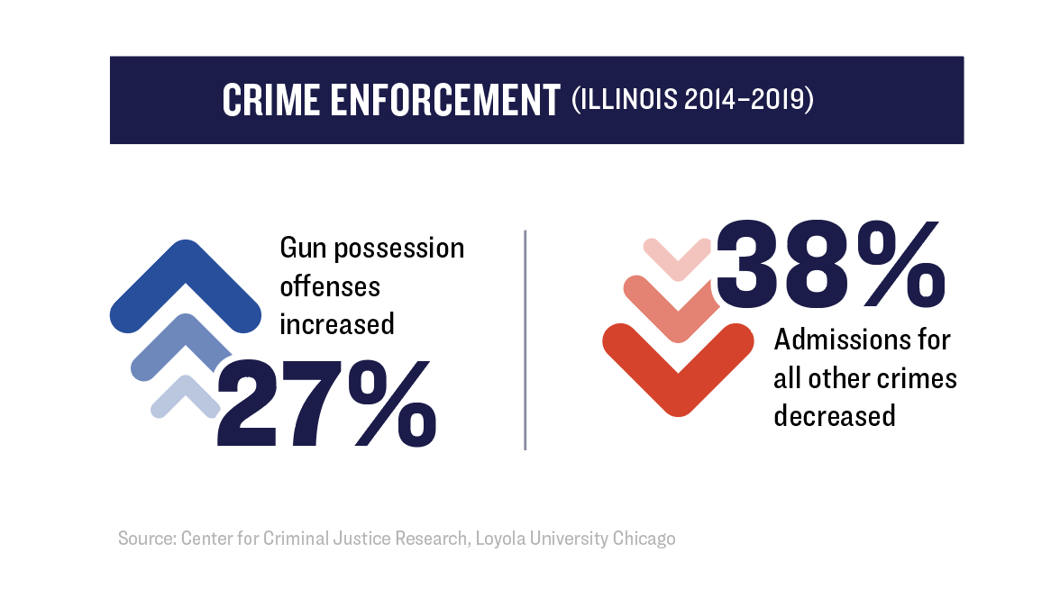 Recent research from a team of criminologists at Loyola University of Chicago found that almost two-thirds of convictions involving a firearm in the state of Illinois over the past decade were for the nonviolent possession of a gun, with disproportionate convictions of Black men.33 Yet despite Illinois’s emphasis on prosecuting illegal gun possession and increasingly harsh punishments—prison admissions for gun possession offenses increased 27% between 2014 and 2019, while admissions for all other crimes fell 38%34—gun homicides in the state increased nearly 29% from 2014 to 2019.35