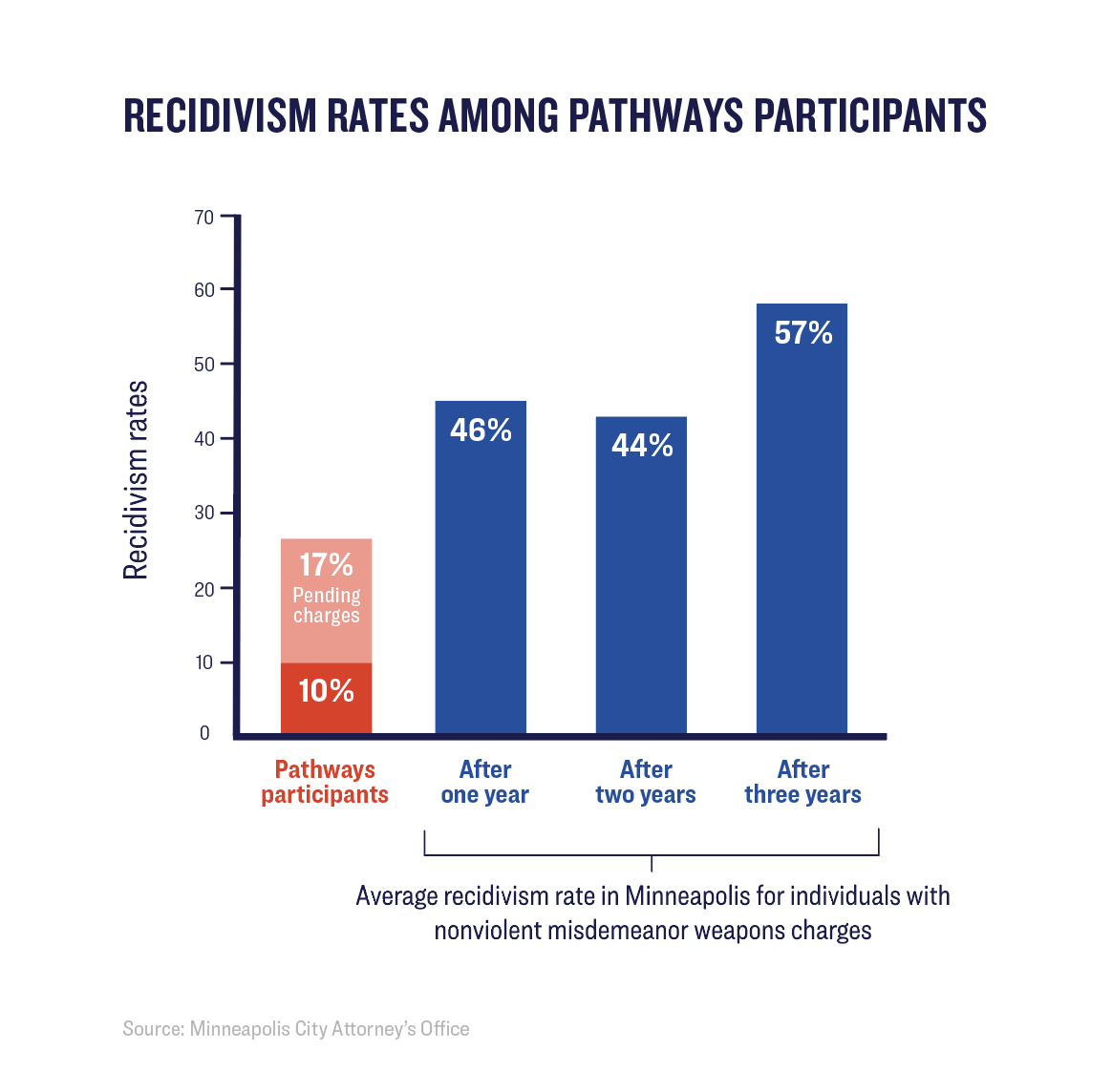 The Pathways to New Beginnings program, designed in partnership with Urban Ventures, a community-based organization in Minneapolis, requires those with nonviolent firearm-related charges to participate in a nine-month process that includes case management and group coursework that focuses on participating in cognitive behavioral therapy, addressing trauma, and building life skills.12