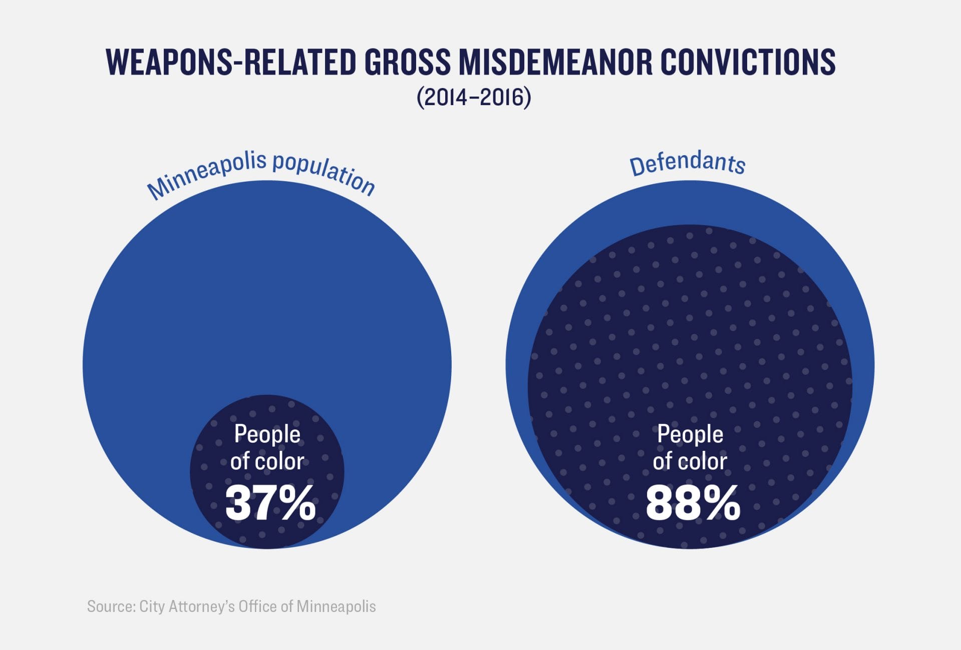 Heng and her team found that of those convicted of a weapons-related gross misdemeanor between 2014 and 2016, 88% were non-white, despite the fact that people of color represented 37% of the overall population in Minneapolis.75 Moreover, the large majority of those charged with non-violent illegal gun possession offenses were Black and between the ages of 18 and 35, while 75% of total convictions were of Black men and youth.76