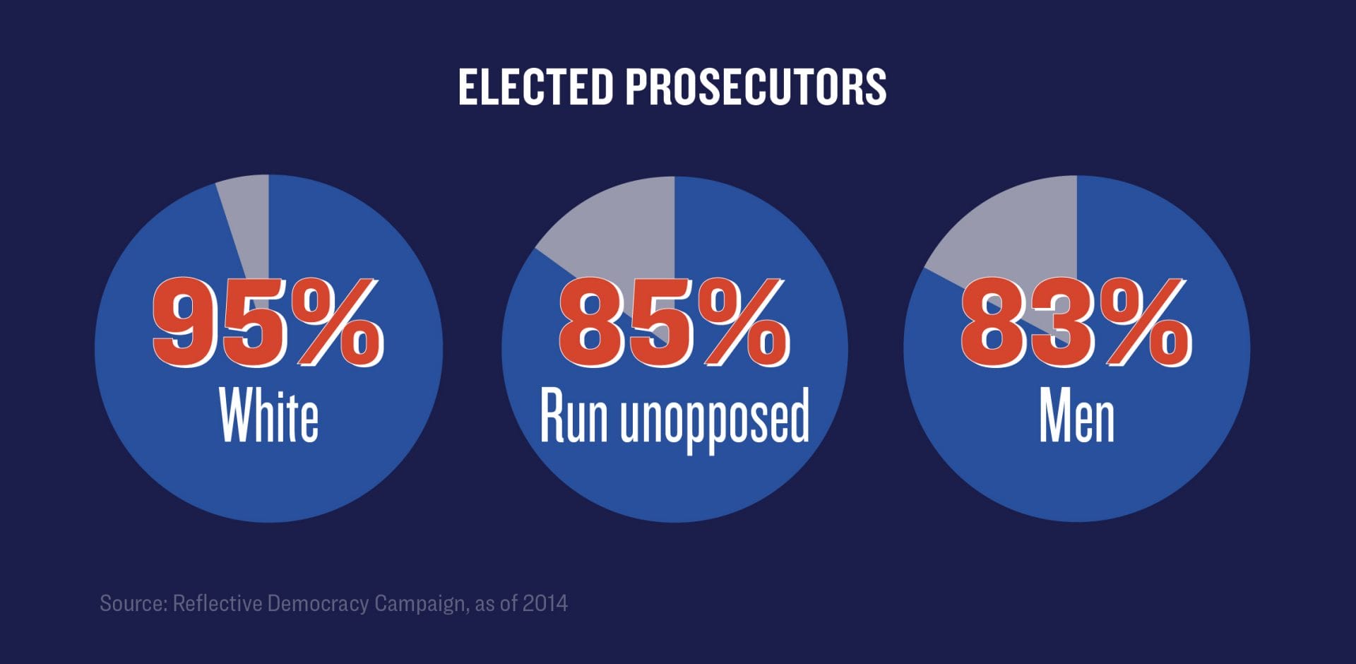 However, this power of choice is not one that voters have historically been able to exercise in practice: a 2015 report from the Reflective Democracy Campaign found that, of the more than 2,400 elected local prosecutors around the country, a large majority of incumbent prosecutors (85%) simply ran unopposed.50 This leaves incumbent prosecutors less accountable to a competitive election process. Low turnover has also maintained the lack of representation of communities of color among prosecutors: the same 2015 report found that 95% of the country’s elected prosecutors were white and 83% were men. Only one percent were women of color.51