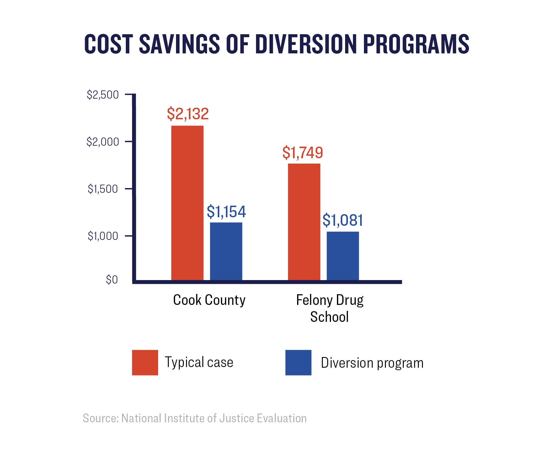 While some are hesitant to expand diversion programming to felonies and more serious charges, evidence suggests this shift can achieve greater outcomes and cost savings while minimizing the risk of net widening. For example, an evaluation of a Drug School program in Cook County, Illinois, that has separate tracks for individuals accused of misdemeanor and felony drug charges, found that only one percent of those enrolled in felony Drug School received a jail sentence, compared to 37% of those who did not opt for diversion.