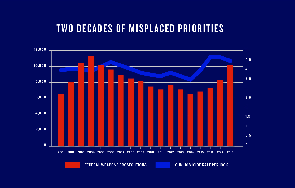 - Syracuse University, “Federal Weapons Prosecutions Rise for Third Consecutive Year,” TRAC Reports, November 29, 2017, https://trac.syr.edu/tracreports/crim/492/; Syracuse University, Federal Weapons Enforcement: A Moving Target,” TRAC Reports, February 13, 2013, https://trac.syr.edu/tracreports/crim/307/.[↩]