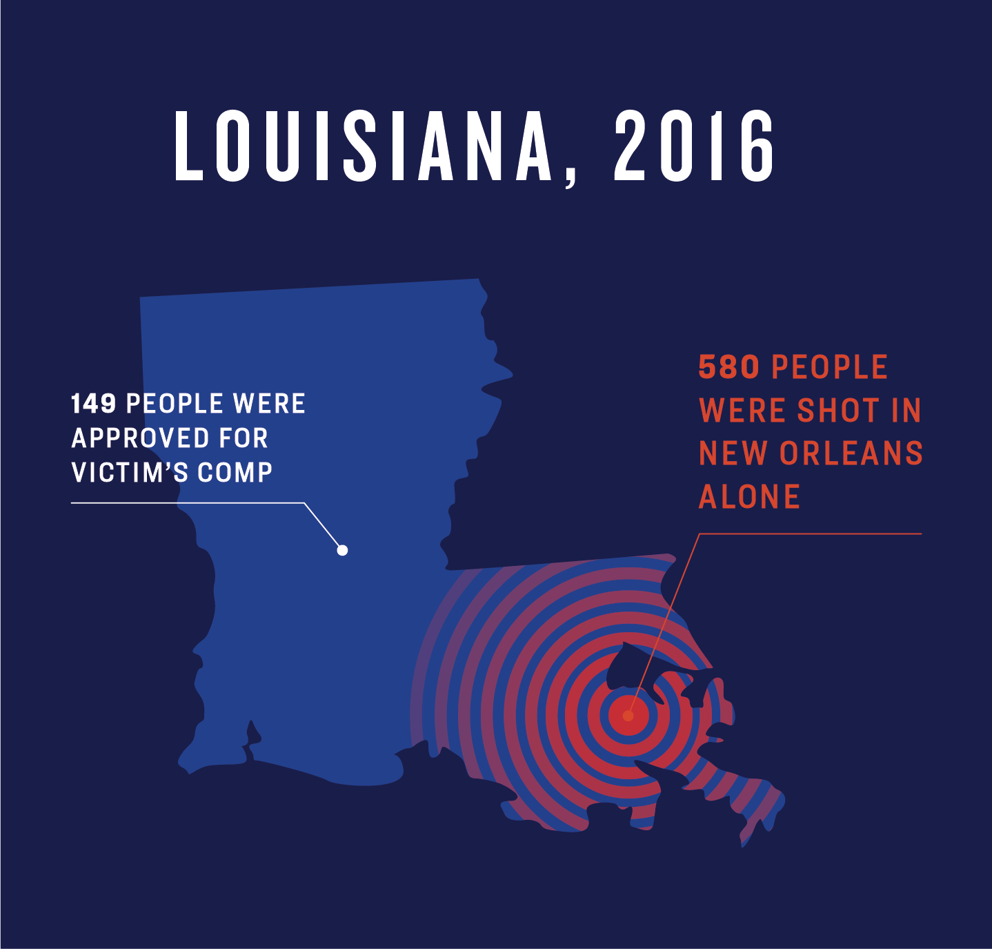 Unfortunately, the difficulties survivors face accessing compensation programs are also well documented. In Louisiana in 2016, for example, a total of 149 people were approved for some amount of victim compensation for firearm-related cases, yet that same year, more than 580 people were shot in New Orleans alone. National data indicates that applicants for victim compensation “tend to be female, white, and between the ages of 25 and 59,”49 despite the fact that this does not align with demographic data about victims of crime—particularly victims of community violence, who are disproportionately young men of color.
