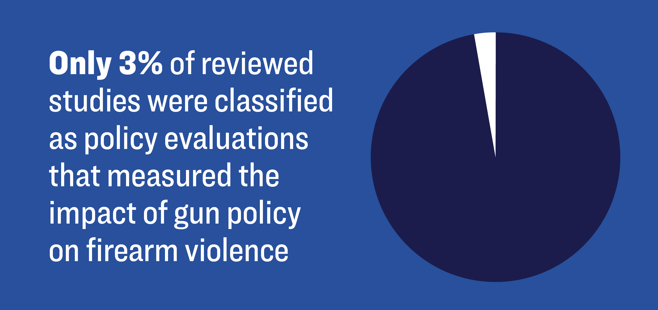 Very few studies examined specific policies (18%) or programs (16%) that are intended to prevent gun violence. Of studies that did look at specific policies or programs, only a small fraction evaluated their impact on gun injuries or deaths. In fact, only three percent of reviewed studies were classified as policy evaluations that measured the impact of gun policy on violence.