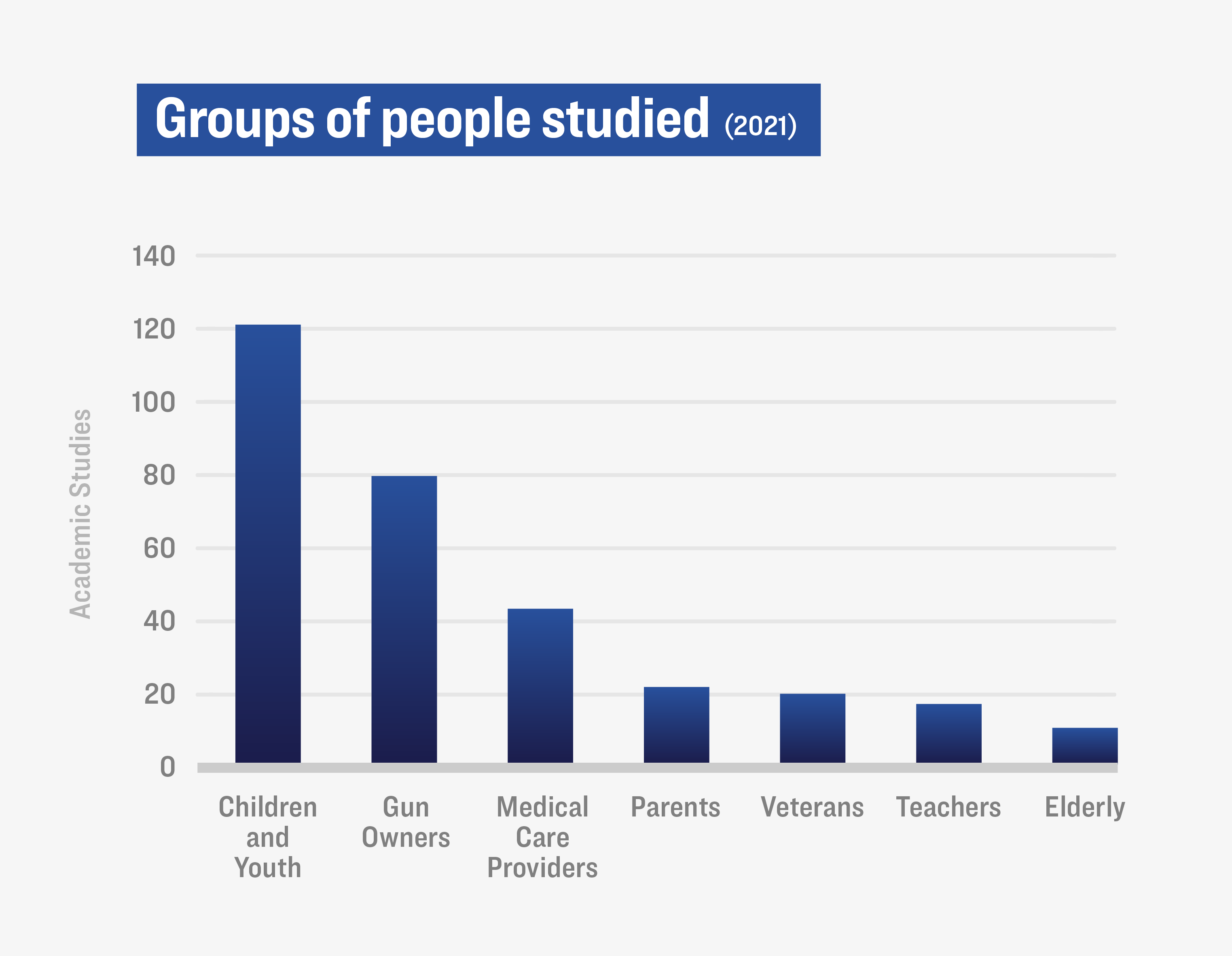 Gun violence touches every community across America, with some research suggesting that nearly all Americans will personally know a victim of gun violence in their lifetime.65 However, there are a number of people who may experience gun violence differently or uniquely because of their demographic or lifestyle characteristics—such as children, the elderly, and gun owners—as well as many groups of people who can play a particularly important role in gun violence prevention, such as medical care providers. We found that gun violence research in 2021 involved study of many of these groups of interest, but there were key differences in the frequency at which these groups were represented.