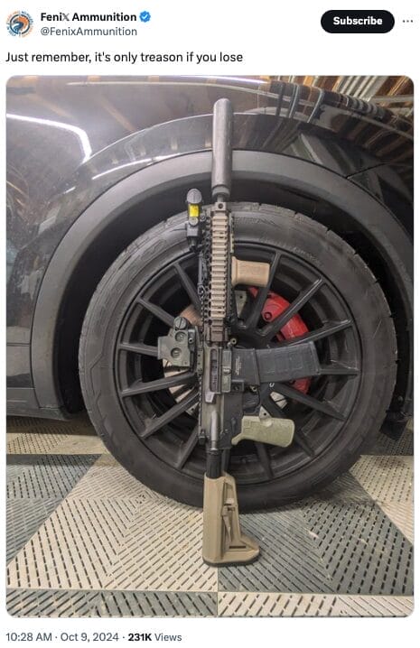 - Fenix Ammunition (@FenixAmmunition), “Just remember, it’s only treason if you lose,” Twitter (now X), October 9, 2024, https://x.com/FenixAmmunition/status/1844022028489404617.[↩]
