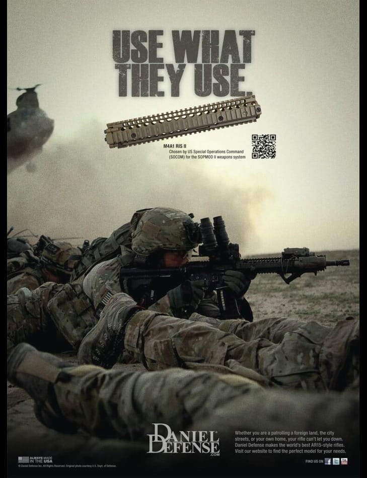 However, this approach has since evolved. Modern gun advertisements often take a more aggressive tone, urging civilians to purchase the same firearms used by soldiers in combat, explicitly encouraging buyers to prepare to defend against “bad guys” in civilian life. Central to this transition was the AR-15 assault weapon.