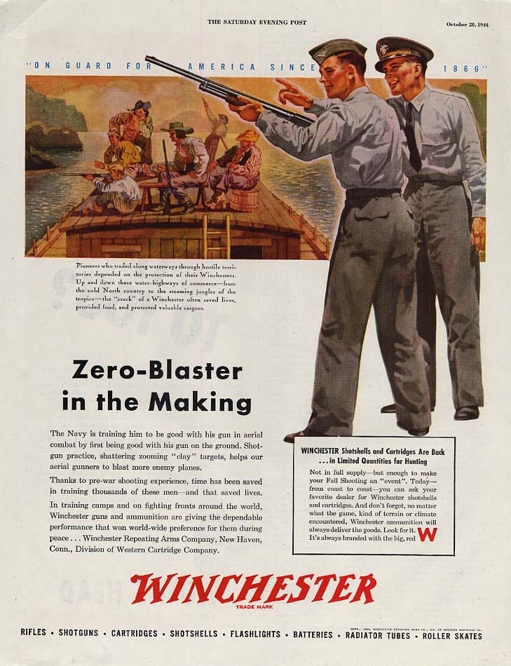 - See, e.g., “Winchester Repeating Rifle and Shot Gun Naval Training 1944 WWII Print Ad,” eBay, last accessed October 21, 2024, https://www.ebay.com/itm/254763131934.[↩]