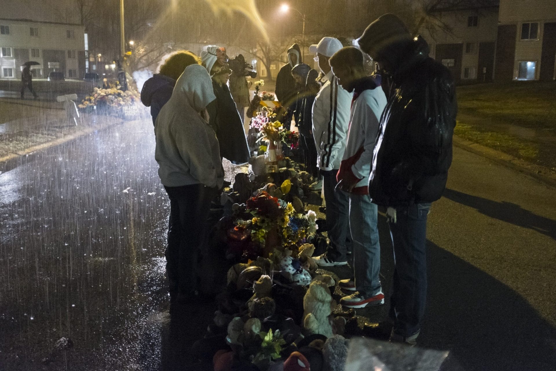 The detective steps into a small living room crowded from wall to wall with photos, trophies, awards, and stuffed animals—mementos to a murdered boy named Dovon. The boy’s mother greets the detective wearing a loose t-shirt with Dovon’s face printed on the front, and gets choked up at the sight of her son’s shoes. They had been held in an evidence locker for nearly a year after Dovon was shot in the head by another boy at a bus stop at the age of 15.