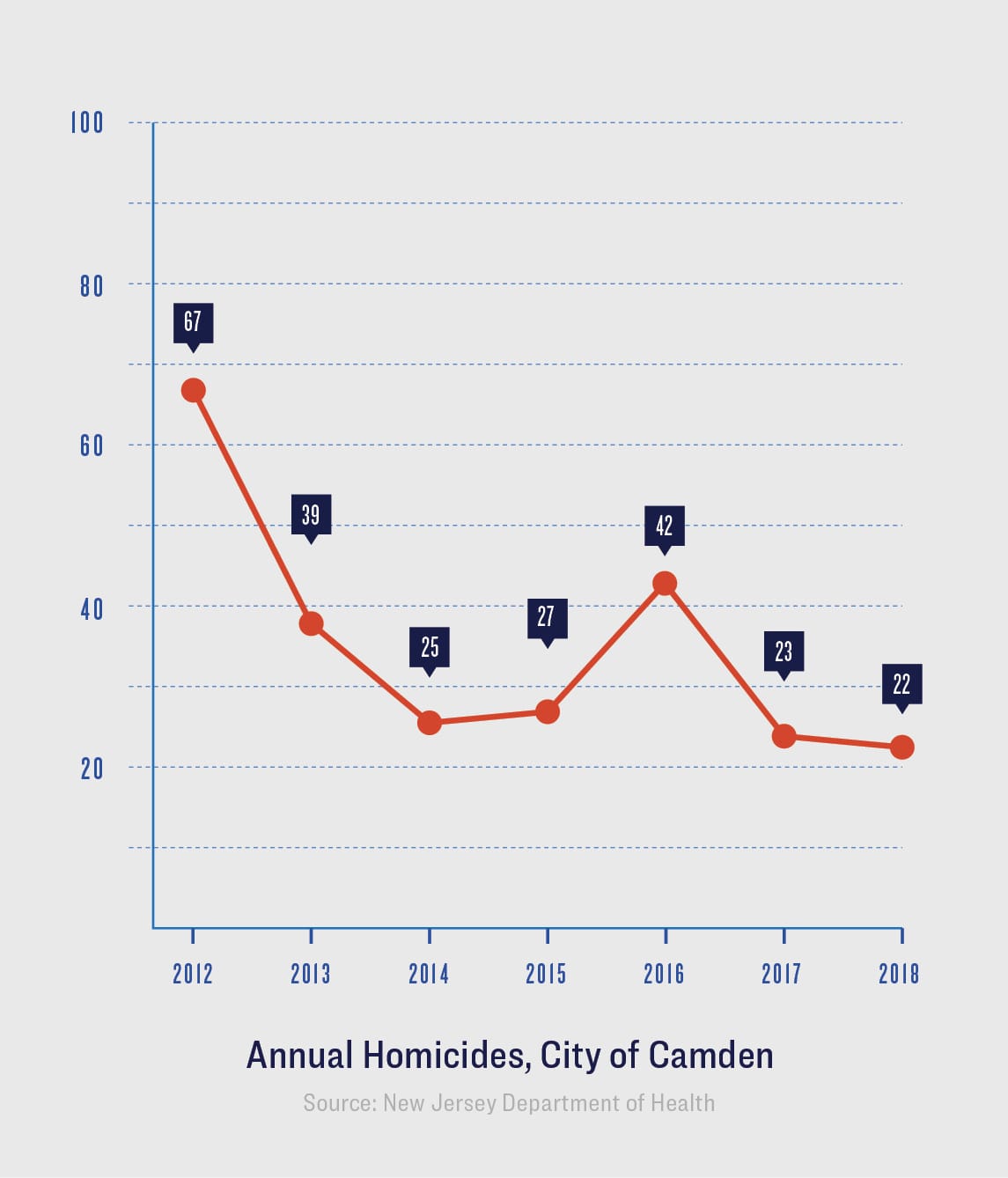 - See Holder, “What Happened to Crime in Camden?”; Jim Walsh, “Police: Camden crime stats improved in 2018,” Cherry Hill Courier-Post, January 4, 2019, https://www.courierpostonline.com/story/news/crime/2019/01/04/camden-homicides-murder-crime-statistics-violent-nonviolent/2482069002/.[↩]