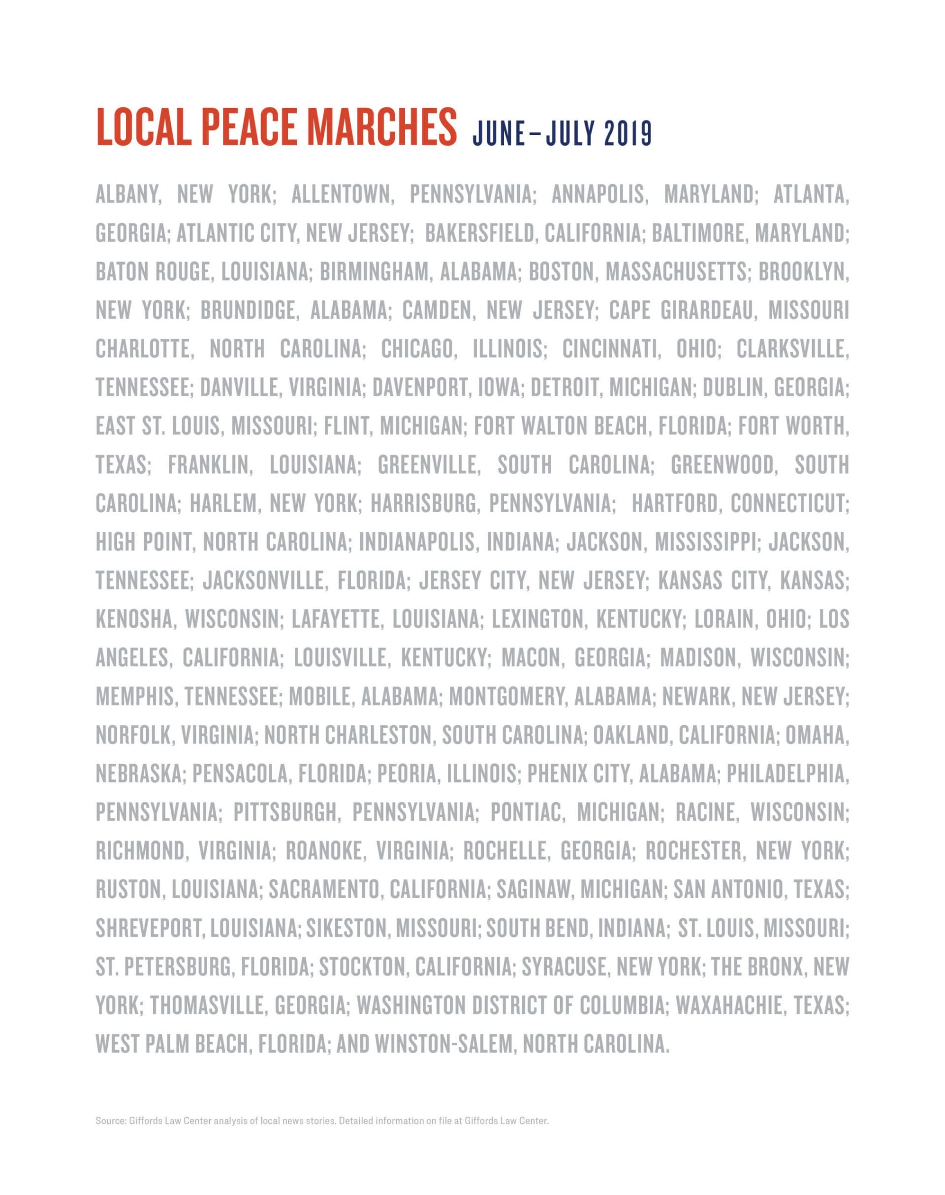 The residents of impacted communities have also mobilized, organized, and marched to call attention to the enormous rates of violence in their communities over and over again.74 Over just a two-month period from June to July 2019, nearly every major city across the United States held locally driven peace marches against community violence.