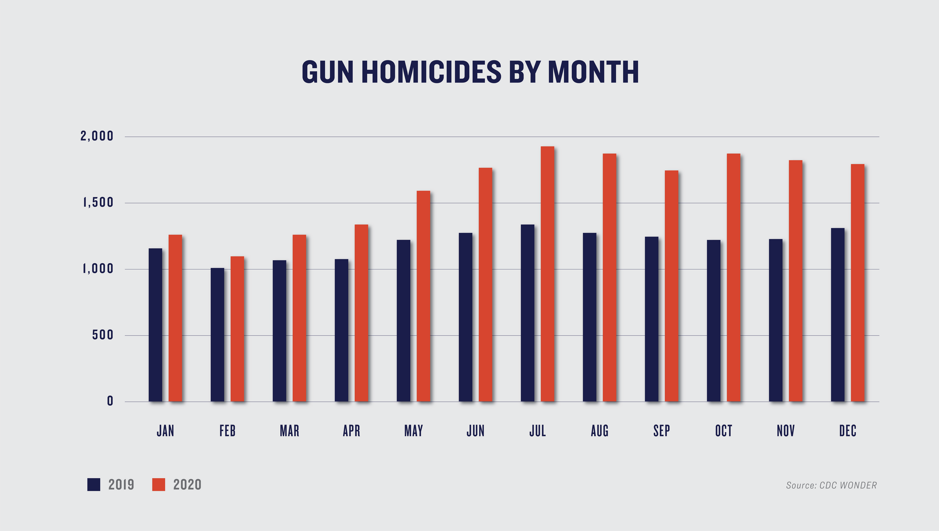 The timing of this surge in gun violence seems to vary somewhat by jurisdiction. However, nationally, there is evidence of larger increases starting in March 2020, coinciding with the declaration of the COVID-19 pandemic, with further intensification in the summer of 2020. Gun homicides in March 2020 were 18% higher than in March 2019, while in June and July 2020, gun homicides were 39% and 44% higher, respectively, than those same months in 2019. Importantly, however, monthly 2020 gun homicides were elevated over 2019 counts in every month, including January and February of 2020, suggesting that some of the factors precipitating this surge were already at work before the pandemic began.