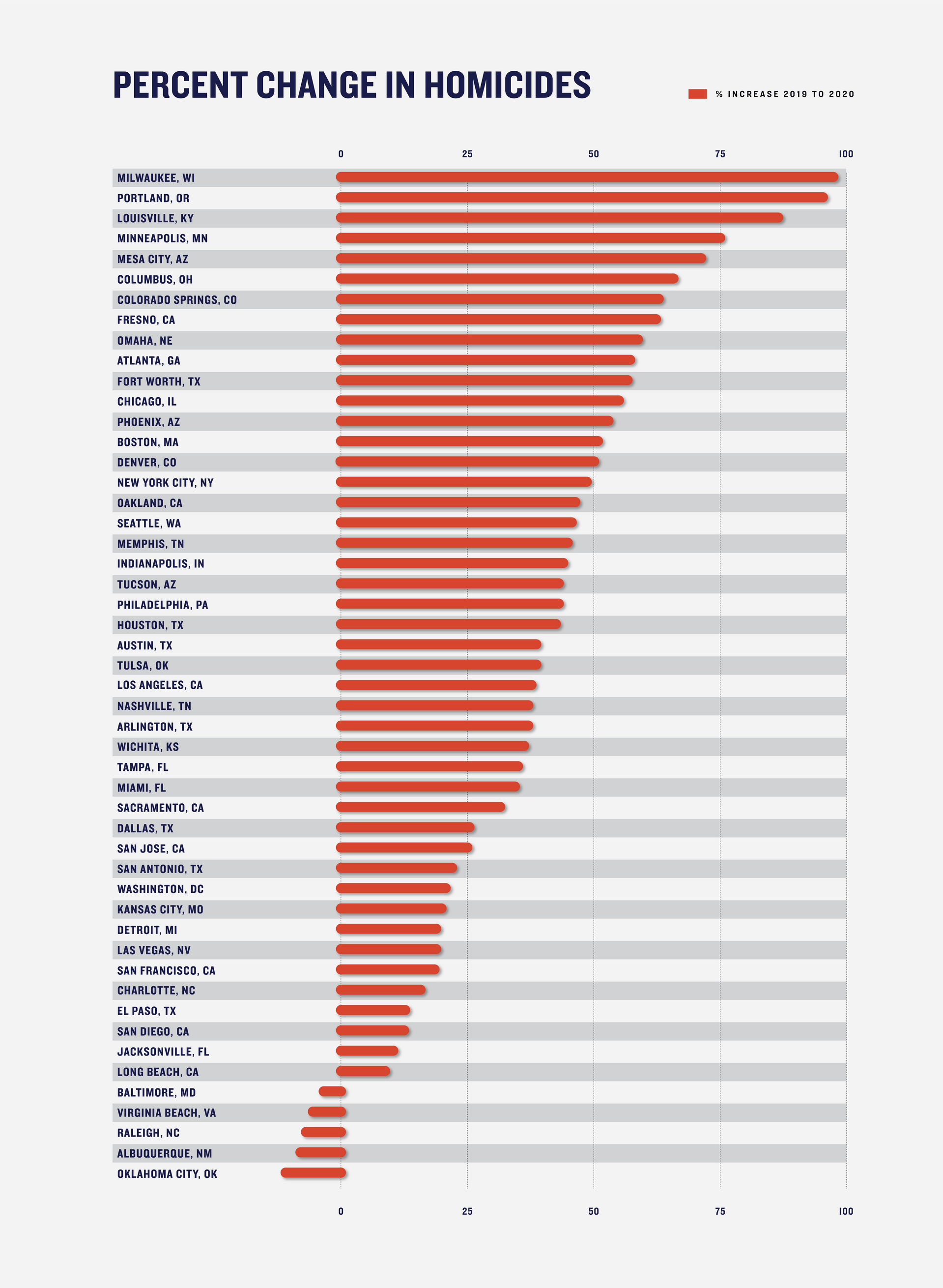 Giffords Law Center compiled police department data from the 50 largest US cities, finding that all but five of these cities saw an increase in homicides in 2020. The vast majority (88%) experienced double-digit increases. Thirty-two of these 50 cities also saw increases in 2021 over 2020 counts. Only one city, Virginia Beach, saw decreases in homicides in both 2020 and 2021.