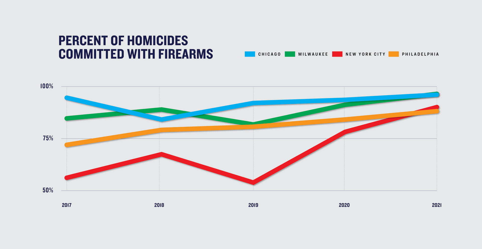 Nationally, guns are used in 76% of all homicides,6 with an even higher percent of homicides involving firearms often found in large cities. Analysis of data from Chicago, Milwaukee, New York, and Philadelphia suggests that guns were used in a higher percentage of 2020 and/or 2021 homicides in these four cities. This trend was most pronounced in New York. From 2017 to 2019, guns were used in 62% of homicides; guns were used in 78% of the city’s homicides in 2020 and 88% of the city’s homicides in 2021.