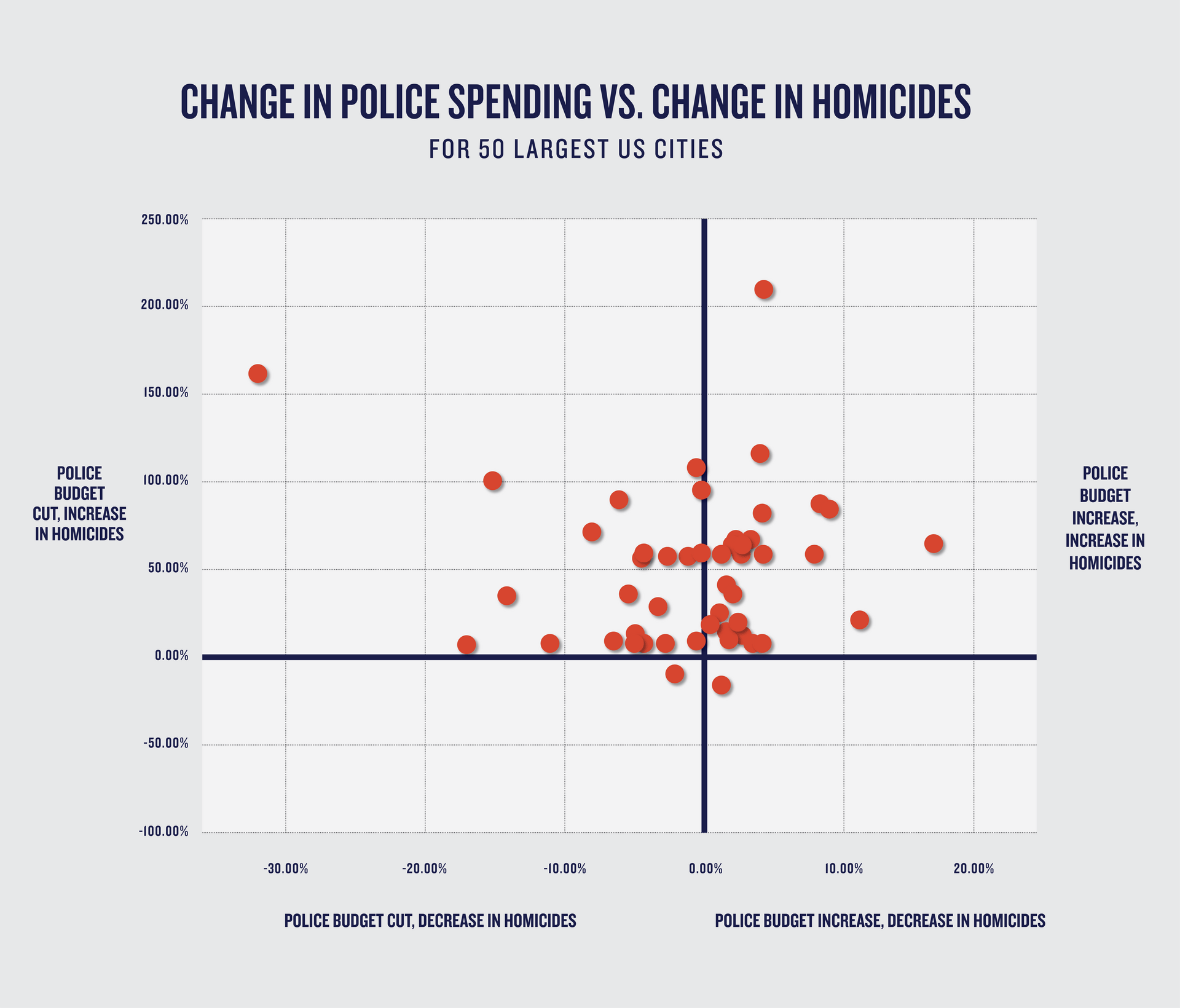 Overall, among the 50 largest cities, police department budgets were reduced by an average of 0.4% from 2020 to 2021.22 However, many large cities actually increased their police budget over this time period,23 and only four of the 50 largest cities cut their police budget by more than 10%. Importantly, among these large cities, a comparison of the percent change in police budgets from 2020 to 2021 to the percent change in total homicides shows no clear correlation.