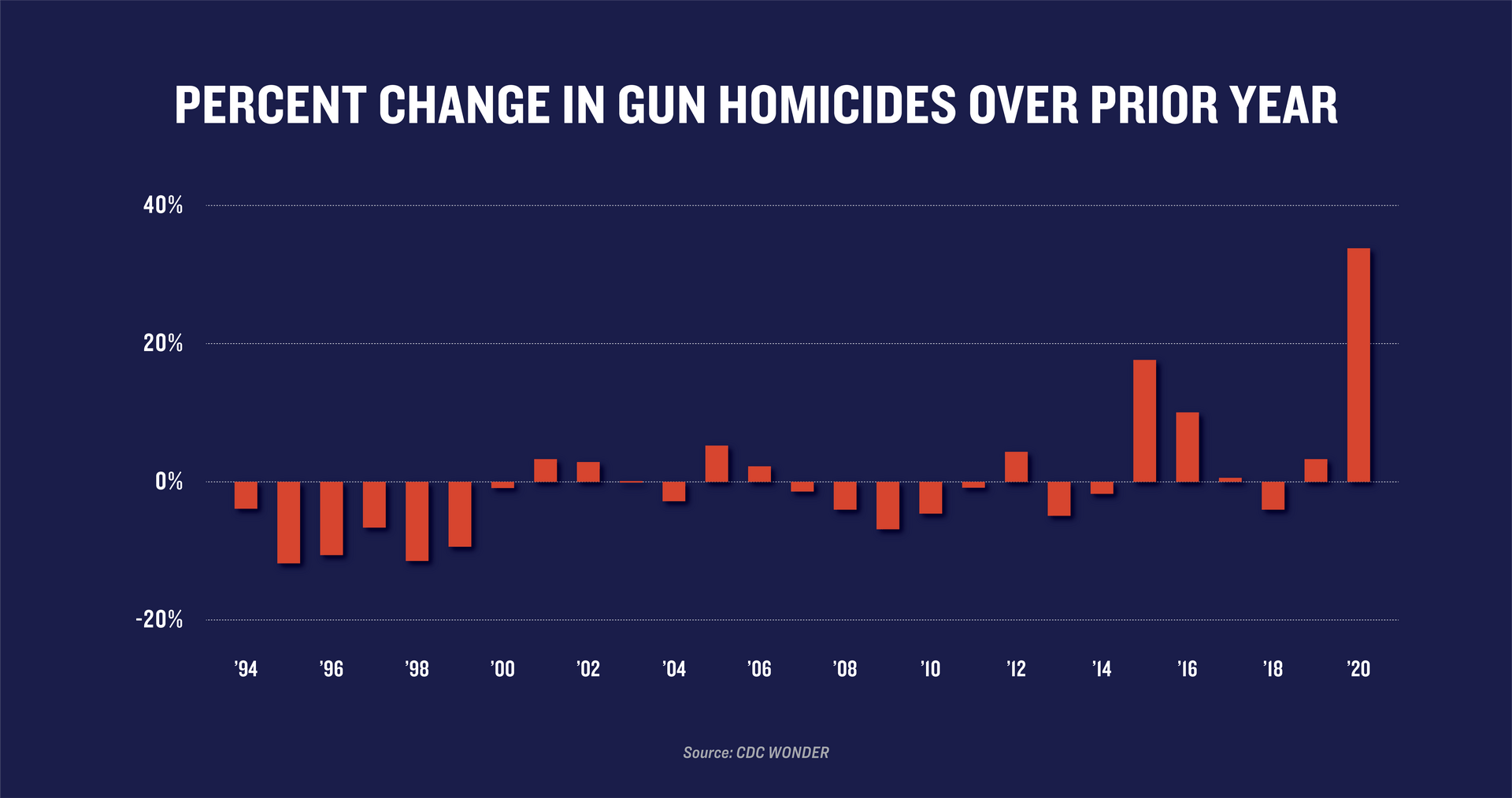 In 2020, 19,384 people were killed in gun homicides—a 35% increase in the gun homicide rate from the previous year. Both the size and the speed of this increase were unprecedented: 2020 represented the largest one-year increase in gun homicides on record. Importantly, while 2020 did not surpass the record high rates of gun homicides that the United States saw in the early 1990s, 2020 saw the highest number of gun homicides in at least four decades.