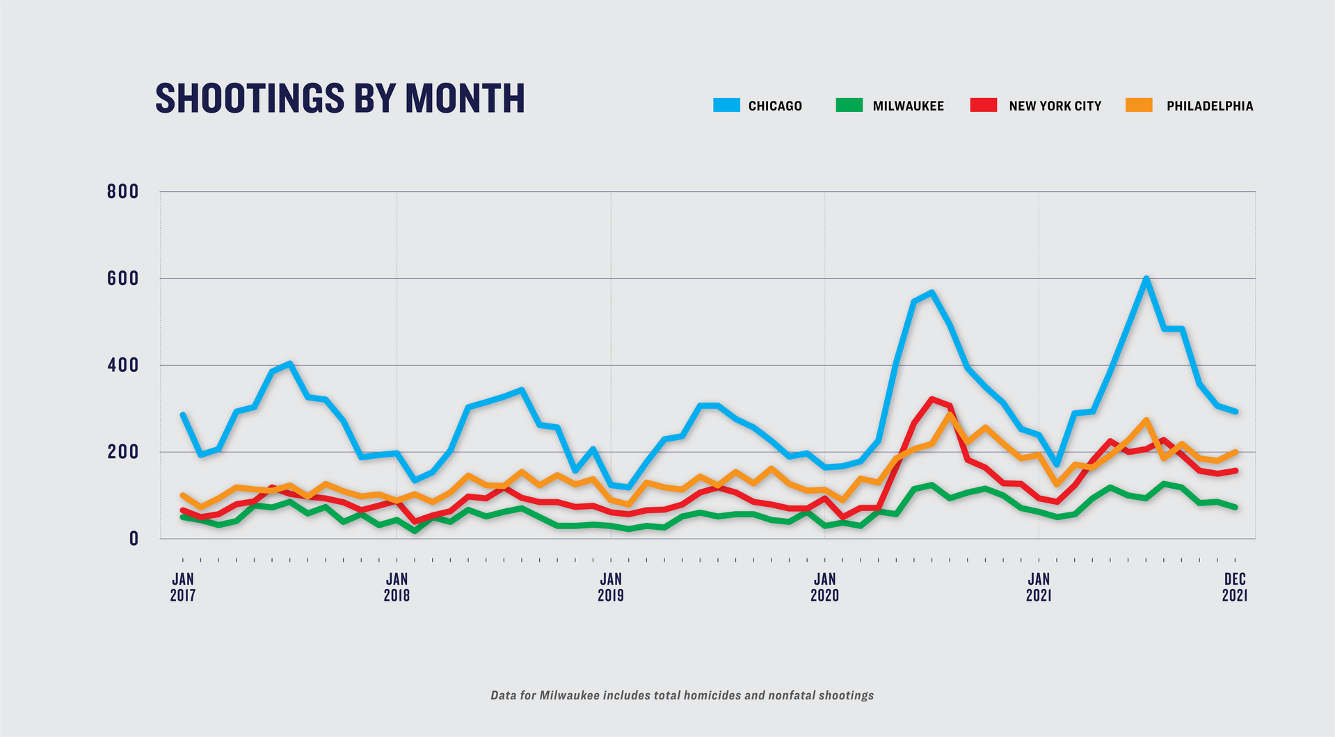 Giffords Law Center conducted original analysis of data from Chicago, New York, Milwaukee, and Philadelphia to examine how these increases changed the underlying dynamics of gun violence. These four cities are some of the only large US cities that publish timely, detailed data on the demographic and geographic characteristics of gun homicides9 and shootings that could be analyzed for 2020 and 2021.10