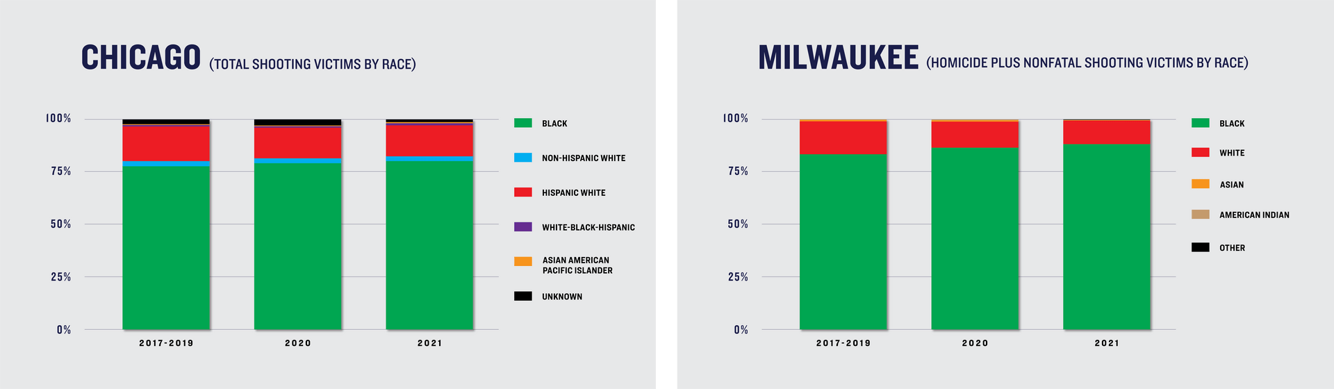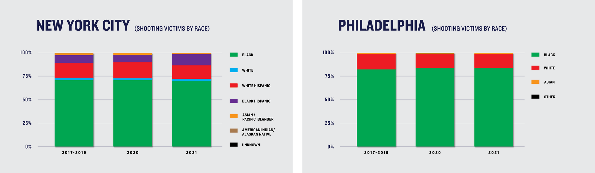 In Chicago, Milwaukee, New York, and Philadelphia, the racial breakdown of victims in 2020 and 2021 held relatively constant compared to previous years.12 Black residents accounted for the majority of victims both historically and in 2020 and 2021, comprising roughly 80% or more of combined fatal and nonfatal shooting victims in each city.