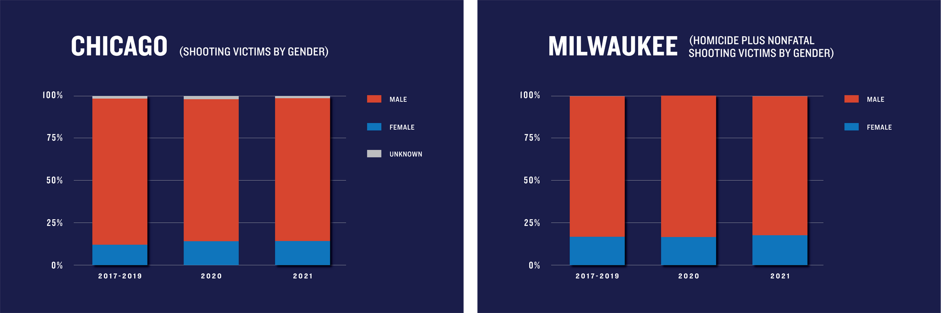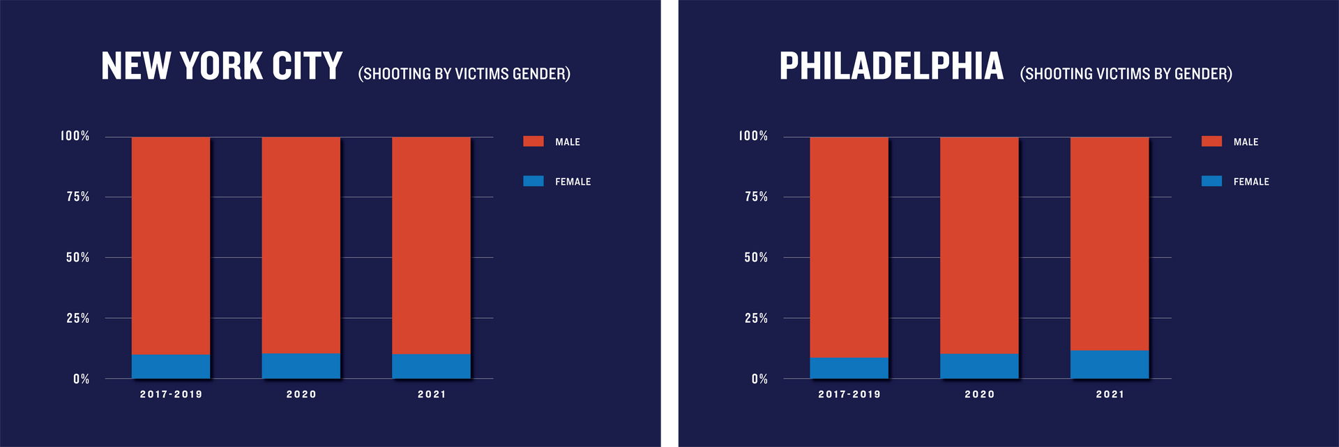 Data shows that shooting victims in 2020 and 2021 also reflected historic trends with respect to victim sex. In all four cities, the vast majority (80 to 90%) of shooting victims were male, a ratio that held consistent in both 2020 and 2021.