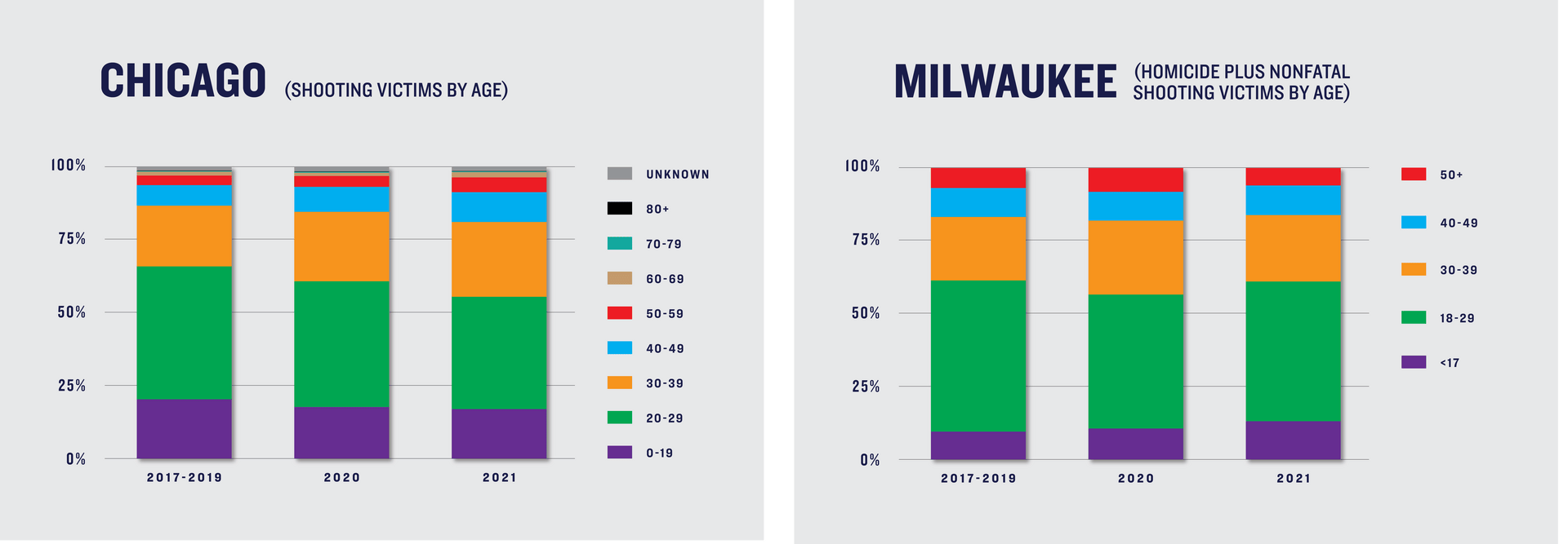 The proportion of child victims increased slightly in Milwaukee, while declining in Chicago. Specifically, in Milwaukee, nine percent of homicide and nonfatal shooting victims from 2017 to 2019 were under age 18, compared to 11% and 13% in 2020 and 2021, respectively. In Chicago, children comprised 20% of shooting victims from 2017 to 2019, 18% of victims in 2020, and 17% of victims in 2021. The proportion of child victims held roughly stable in New York and Philadelphia.