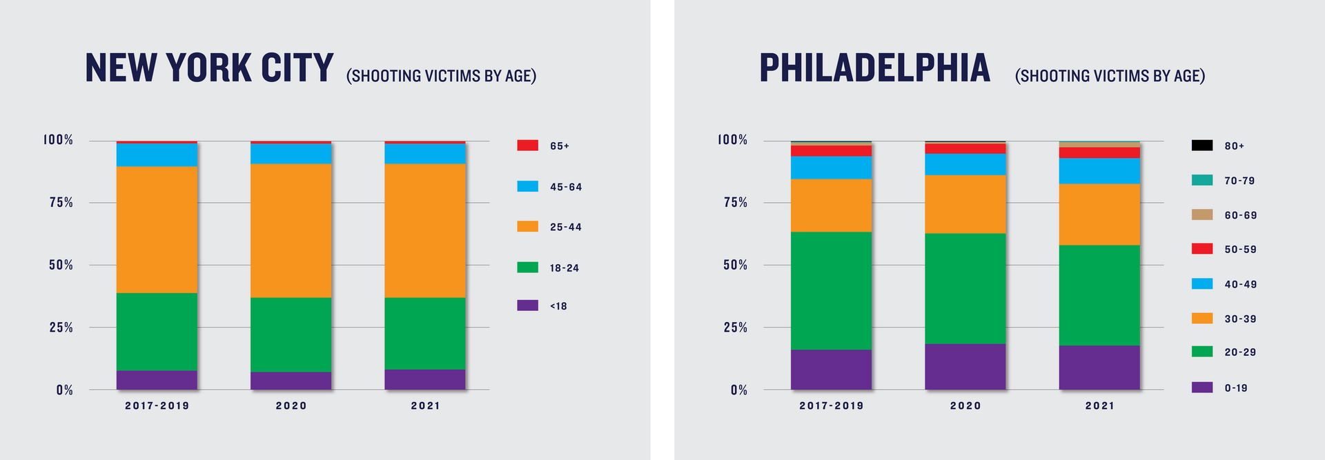 The ages of shooting victims appear to have remained most stable in New York. The largest observed change in New York was an increase in the number of victims ages 25 to 44, from 51% of all victims from 2017 to 2019 up to 55% and 54% of 2020 and 2021 shooting victims, respectively.