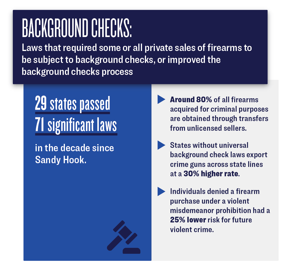 In the wake of federal inaction, courageous legislators in states across the country took steps to save lives from gun violence. This state-level progress, hard-won and often incremental, saved lives. As we look ahead to the next 10 years of the gun safety movement, we must continue to push for the passage and effective implementation of these commonsense solutions.