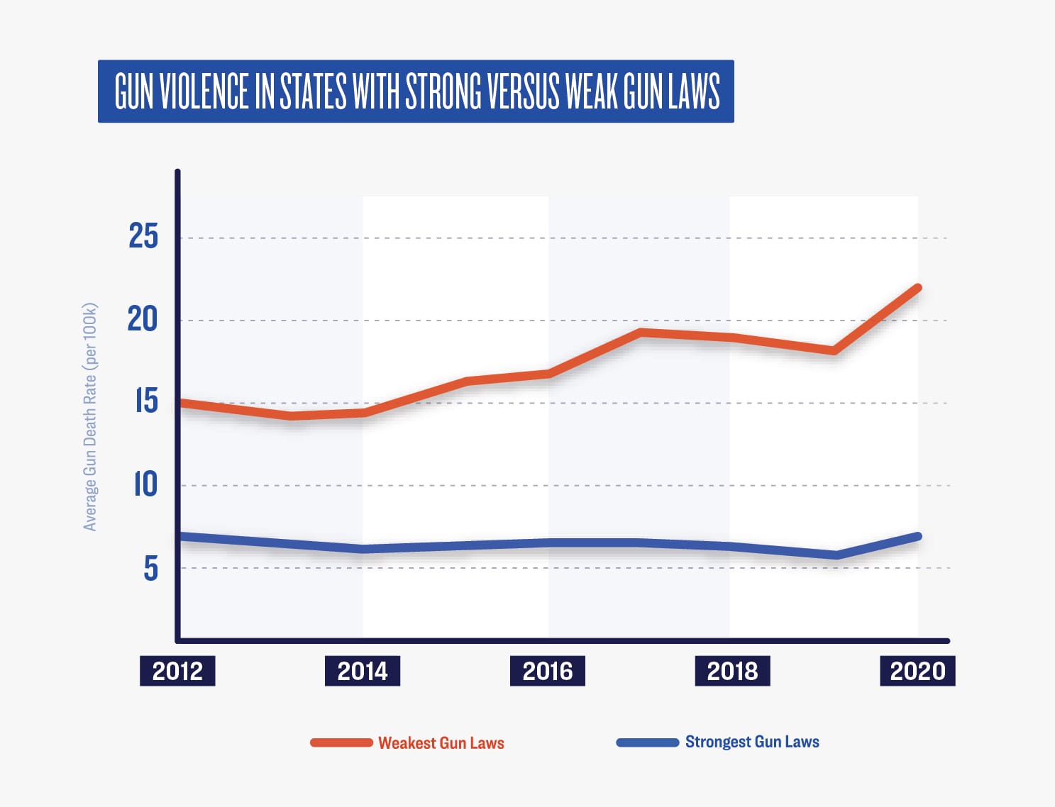 From 2012 to 2020, gun deaths rose 46% in the five states with the weakest gun laws—from a rate of 14.7 deaths per 100,000 people to a rate of 21.5. In comparison, gun deaths rose only seven percent in the five states with the strongest gun laws—from a rate of 6.7 deaths per 100,000 people to a rate of 7.2.