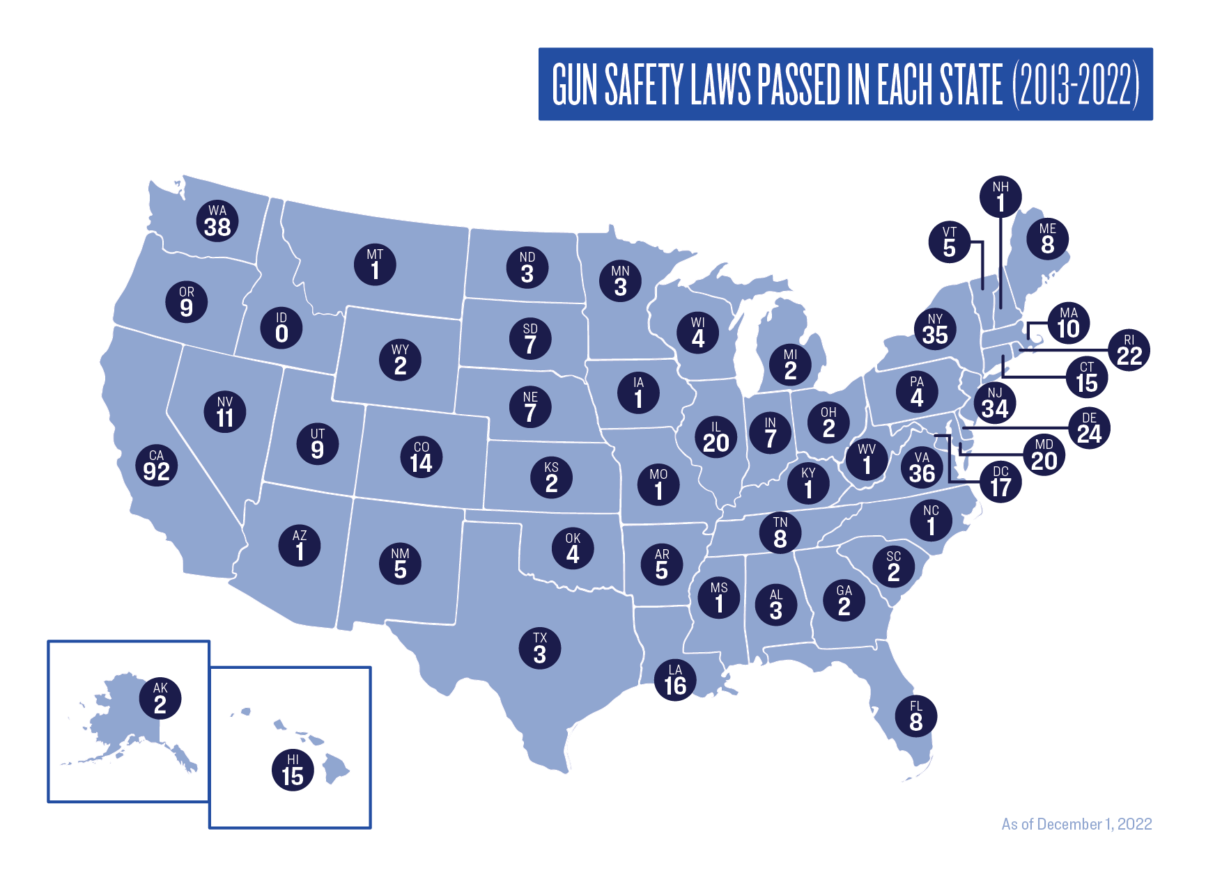 But an inconsistent patchwork of state gun laws leaves all Americans vulnerable, as guns are often trafficked from states with weak laws to those with strong ones. This summer, following tragedies in Buffalo and Uvalde, the federal government passed the first major gun safety legislation in nearly 30 years. This is a tremendous step forward, but we can’t stop here. Below, we explore what state-level progress looked like over the past decade, and how this might serve as a blueprint for future state and federal legislation.