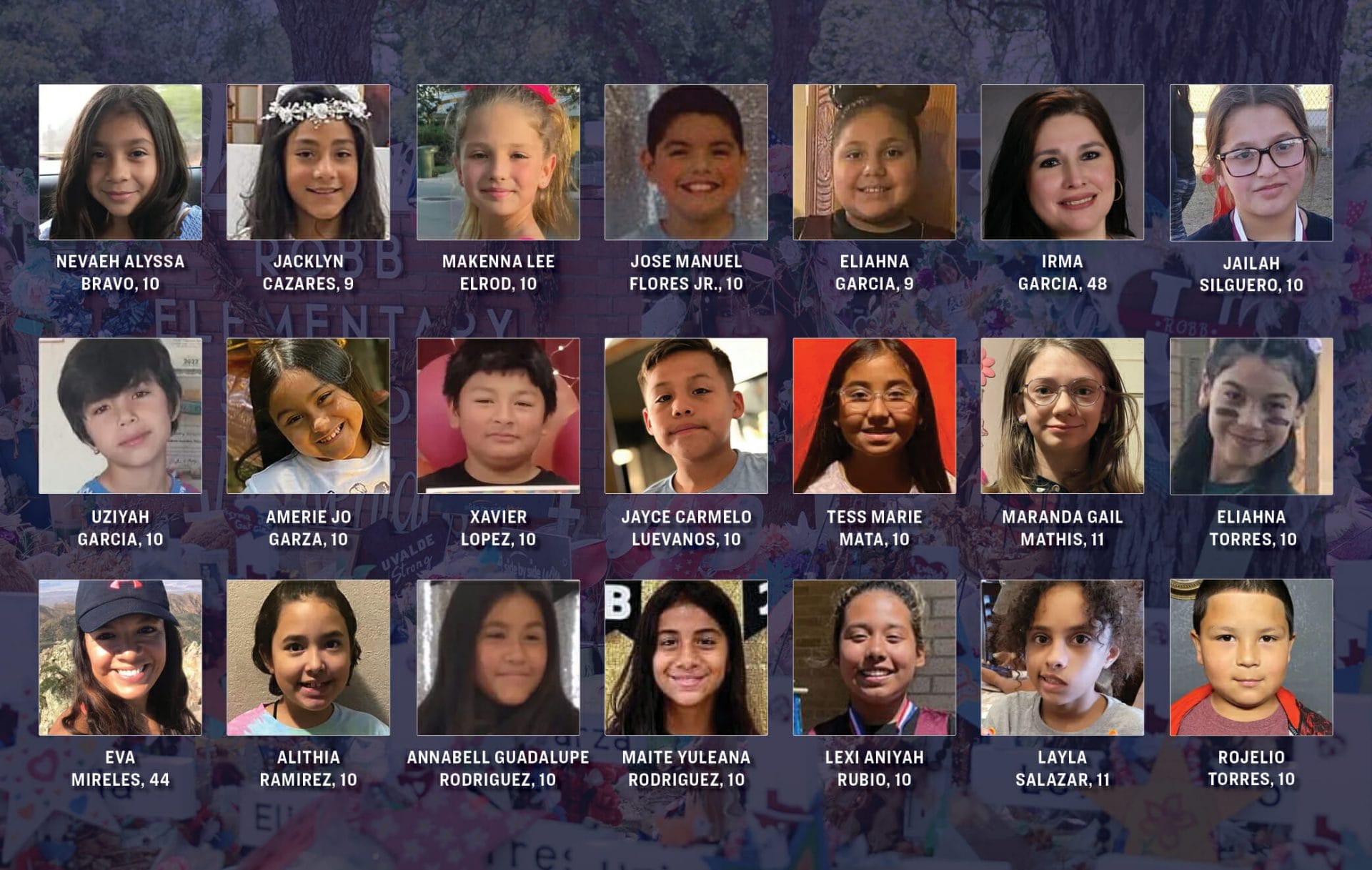 Nevaeh Alyssa Bravo, 10; Jacklyn Jaylen Cazares, 9; Makenna Lee Elrod, 10; Jose Manuel Flores Jr., 10; Eliahna Amyah Garcia, 9; Uziyah Sergio Garcia, 10; Amerie Jo Garza, 10; Xavier James Lopez, 10; Jayce Carmelo Luevanos, 10; Tess Marie Mata, 10; Maranda Gail Mathis, 11; Alithia Haven Ramirez, 10; Annabell Guadalupe Rodriguez, 10; Maite Yuleana Rodriguez, 10; Alexandria Aniyah Rubio, 10; Layla Marie Salazar, 11; Jailah Nicole Silguero, 10; Eliahna Cruz Torres, 10; Rojelio Fernandez Torres, 10; Irma Linda Garcia, 48; Eva Mireles, 44.