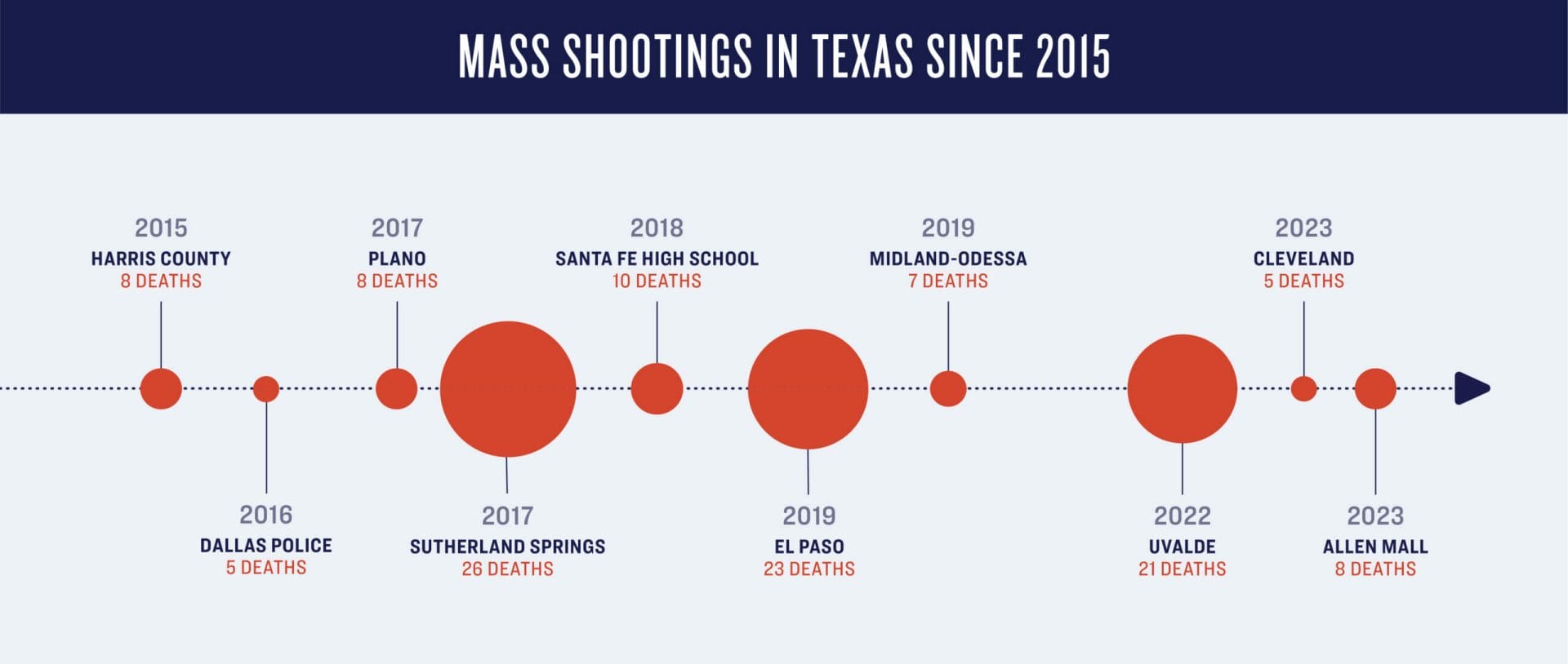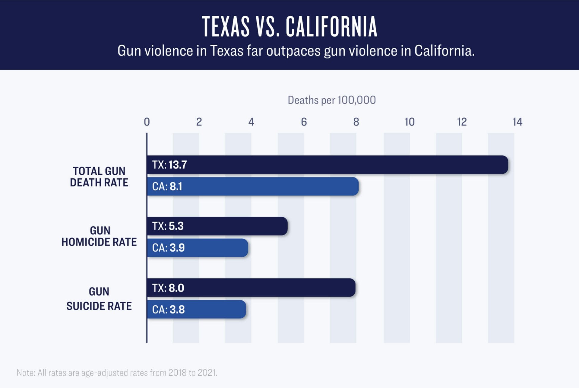 Other politically conservative states, including Florida, have come together in recent years to enact policies to address senseless gun violence—but one whole year after the tragedy at Robb Elementary School, Texas has failed to take action. Officials continue to offer thoughts and prayers following the unending cycle of gun violence–related tragedies—most recently following the shooting at an outlet mall in Allen, Texas, and in a neighborhood in Cleveland, Texas, both incidents involving AR-15 style rifles and killing young children—but no significant gun safety legislation has passed in the state. In fact, the only major movement has been in the opposite direction, with the Texas legislature passing and Governor Greg Abbott signing a law in 2021 allowing people to carry loaded and concealed handguns in public without a permit.4
