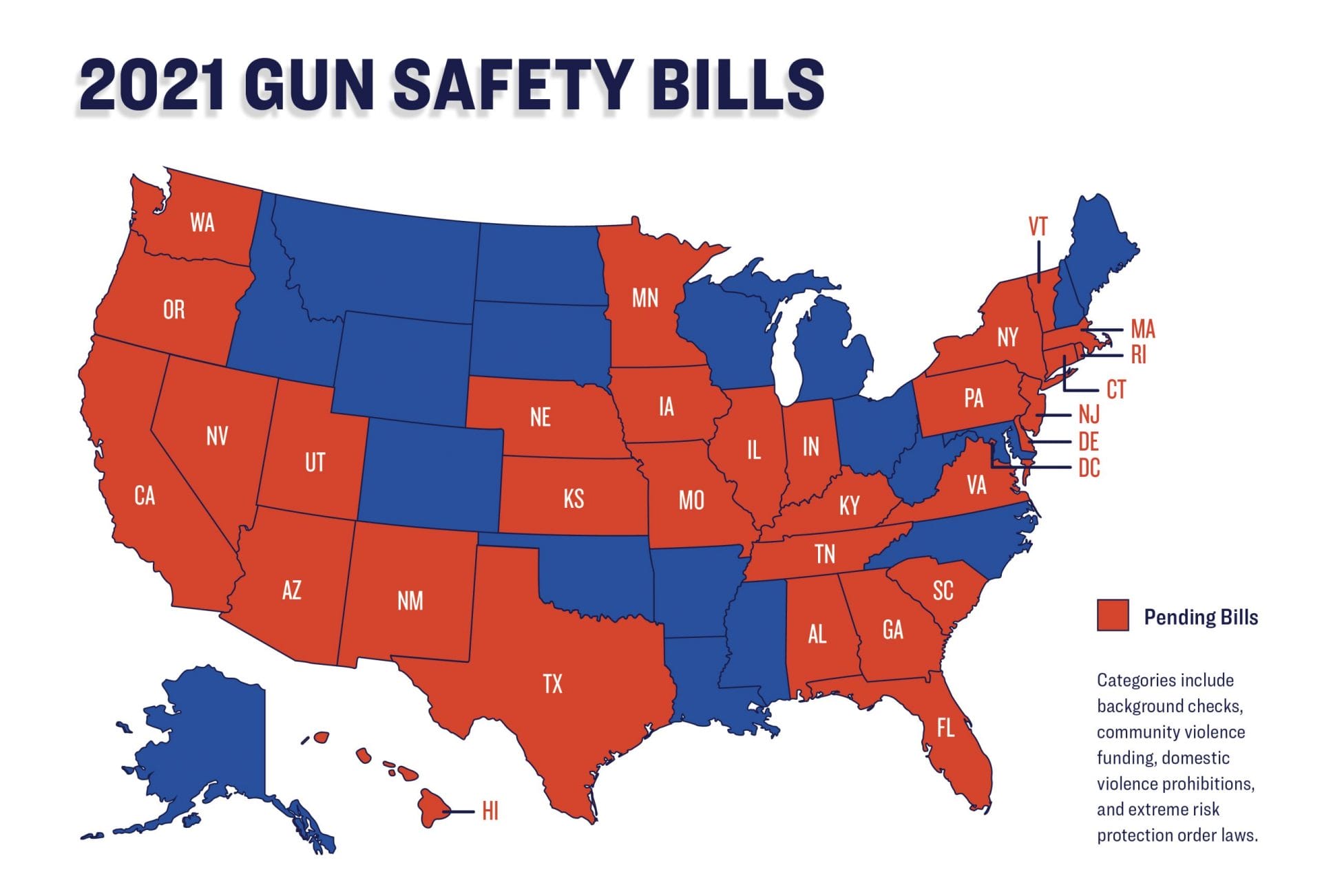 In the first few months of 2021, courageous state legislators have introduced bills to strengthen background check requirements, fund proven community violence intervention programs, improve domestic violence prohibitions, and enact or strengthen extreme risk protection order laws in 31 states and the District of Columbia. Meanwhile, the gun lobby continues to push its dangerous guns in schools and permitless carry bills in dozens of states. We’re committed to helping state legislatures enact laws that will make our communities safer and push back against gun lobby legislation that will bring more guns to more places.