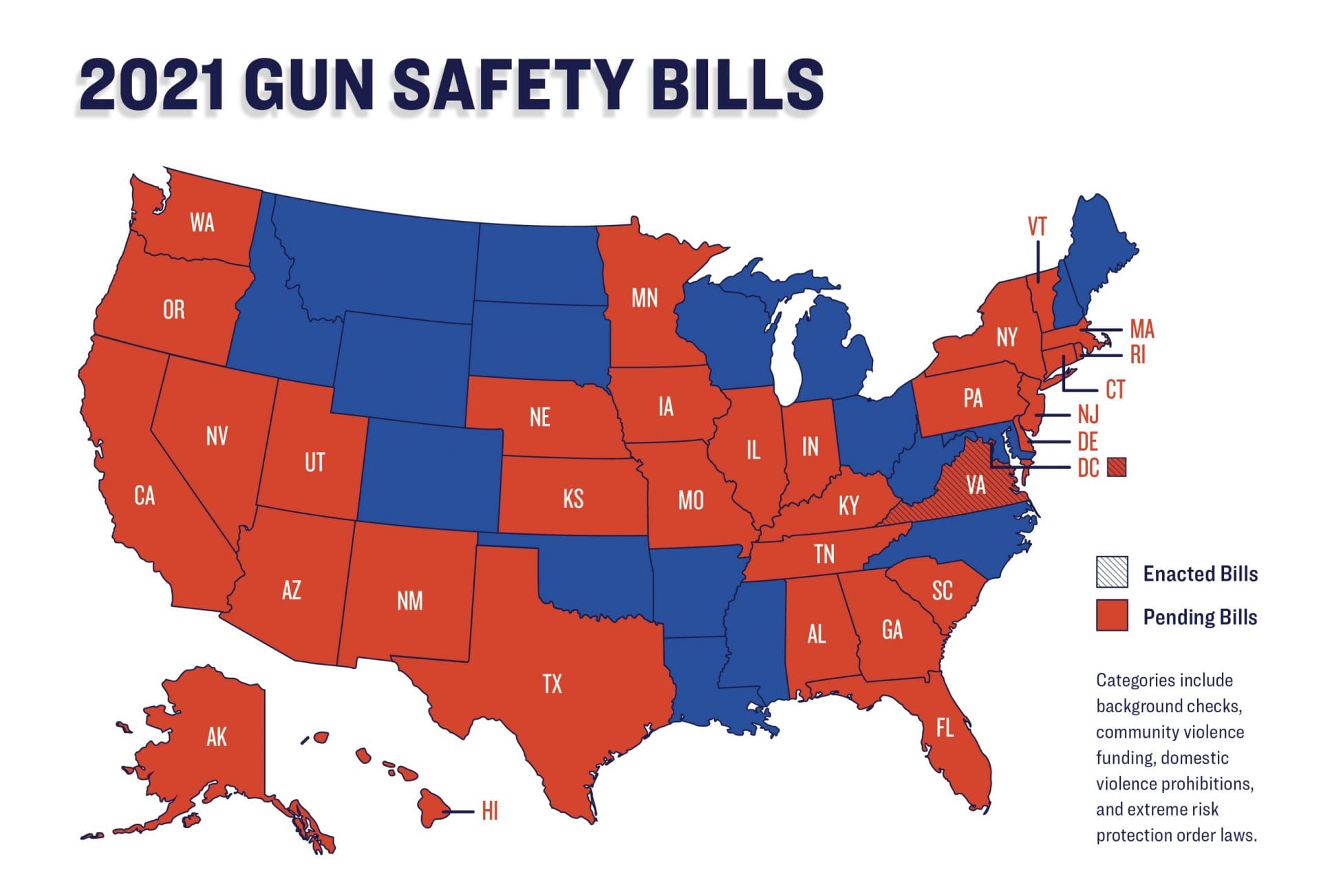 In the first few months of 2021, courageous state legislators have introduced bills to strengthen background check requirements, fund proven community violence intervention programs, improve domestic violence prohibitions, and enact or strengthen extreme risk protection order laws in 33 states and the District of Columbia. Meanwhile, the gun lobby continues to push its dangerous guns in schools and permitless carry bills in dozens of states. We’re committed to helping state legislatures enact laws that will make our communities safer and push back against gun lobby legislation that will bring more guns to more places.