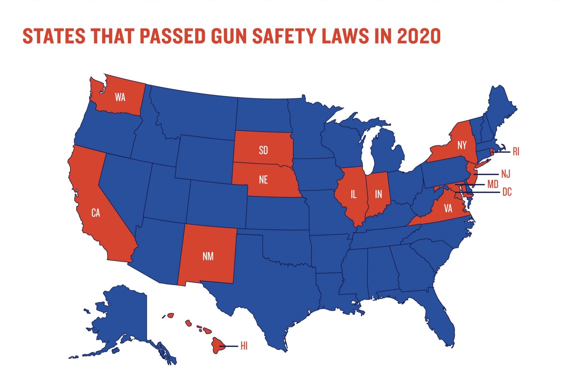In 2020, 42 bills passed in 13 states and DC, bringing the total number of laws passed since the massacre in Parkland, Florida, to 179. Although our nation remains divided on many issues, this progress has been bipartisan—since the Parkland tragedy in February 2018, 16 states with Republican governors have signed gun safety bills into law.