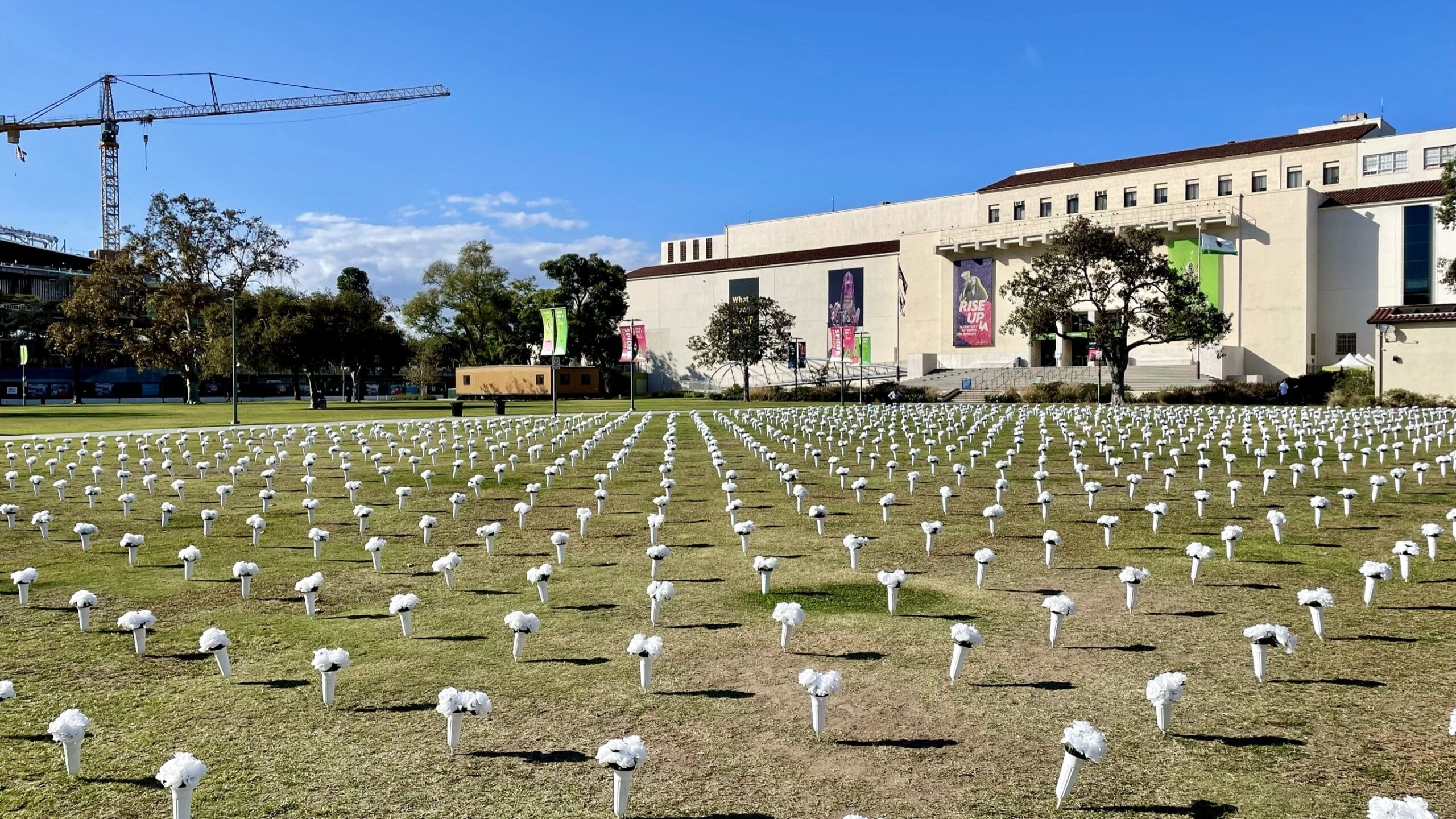 The Gun Violence Memorial has come to Exposition Park in Los Angeles to remember victims of gun violence and inspire the #CourageToAct. These vases of white flowers honor the 3,400 Californians who died from gun violence in 2020.