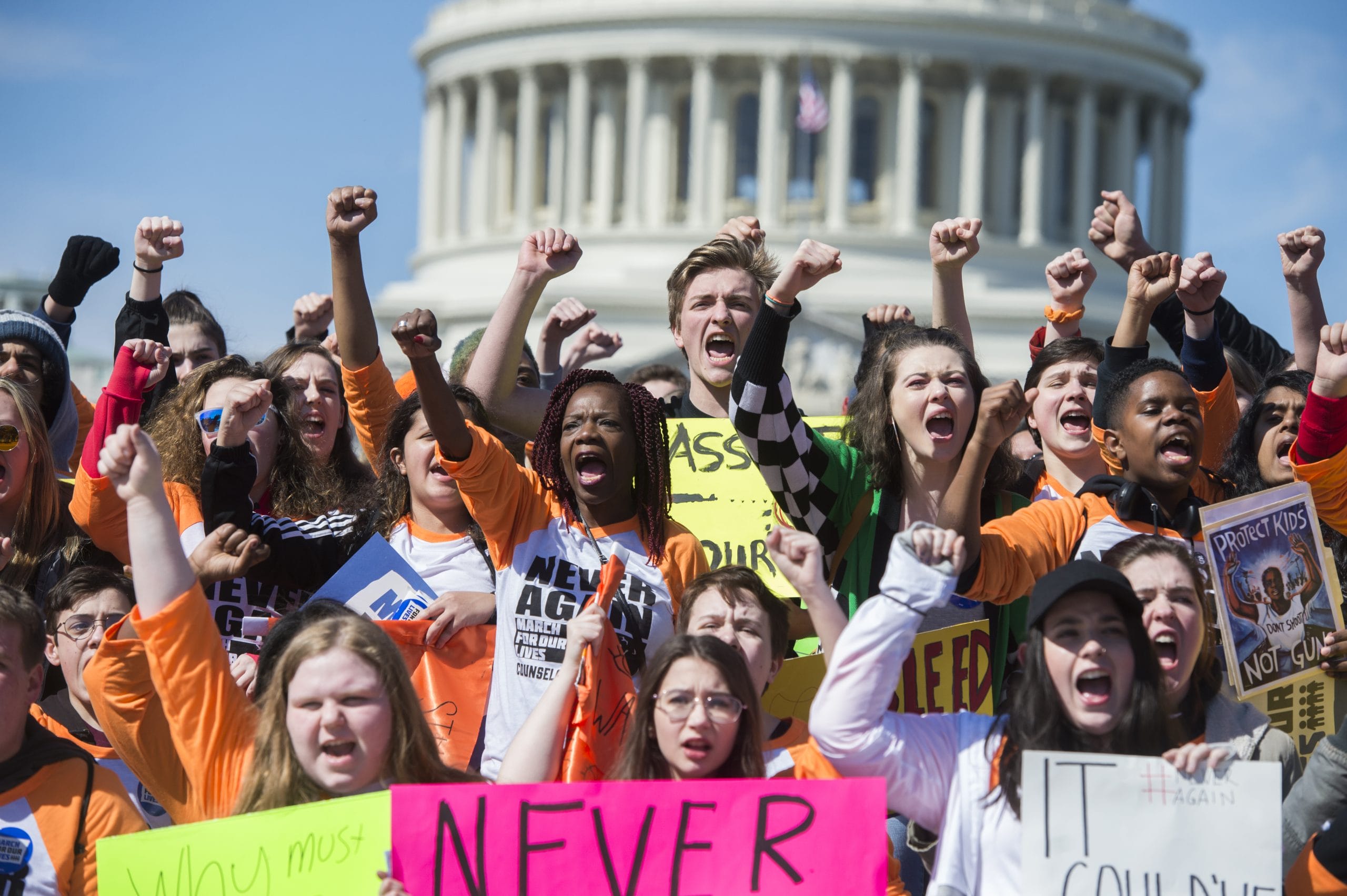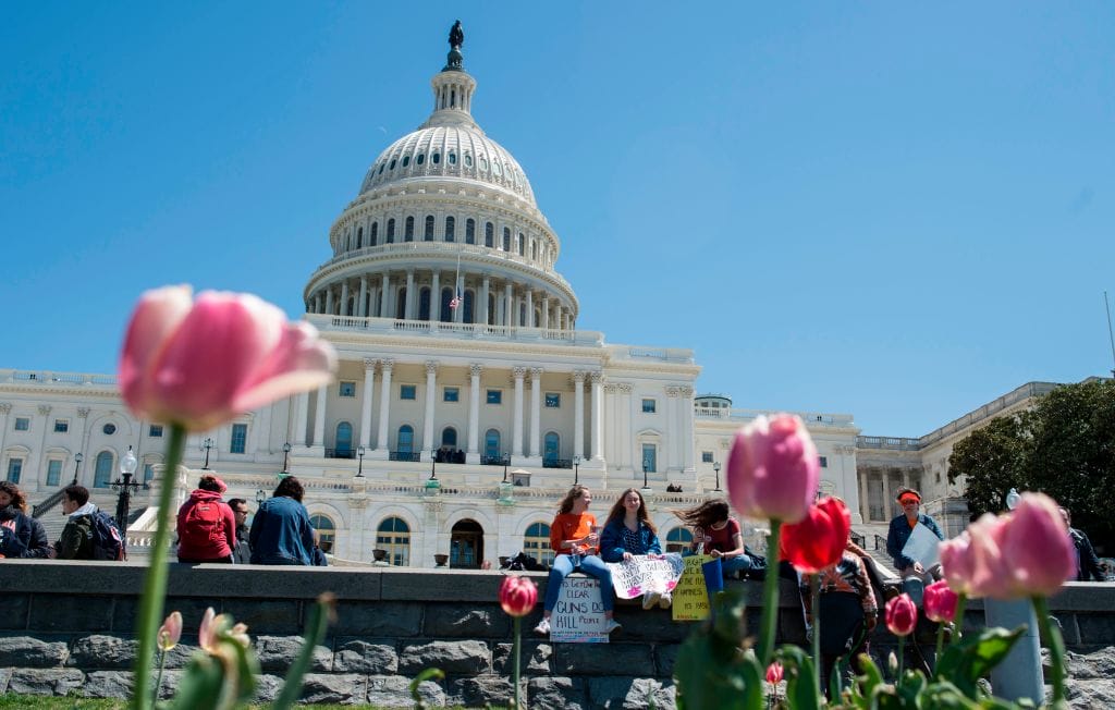 Students sit on the wall of the West Lawn of the US Capitol after rallying with several hundred fellow students to call for stricter gun laws in Washington, DC on April 20, 2018 to protest gun violence. – Students across the US were urged to walk out of classes to mark the 19th anniversary of the 1999 school shooting at Columbine High School in Colorado which left 13 people dead. The walkout has been organized by students at Marjory Stoneman Douglas High School in Parkland, Florida, where 14 students and three adult staff members were killed by a troubled former classmate on February 14, 2018. (Photo by Andrew CABALLERO-REYNOLDS / AFP) (Photo credit should read ANDREW CABALLERO-REYNOLDS/AFP via Getty Images)