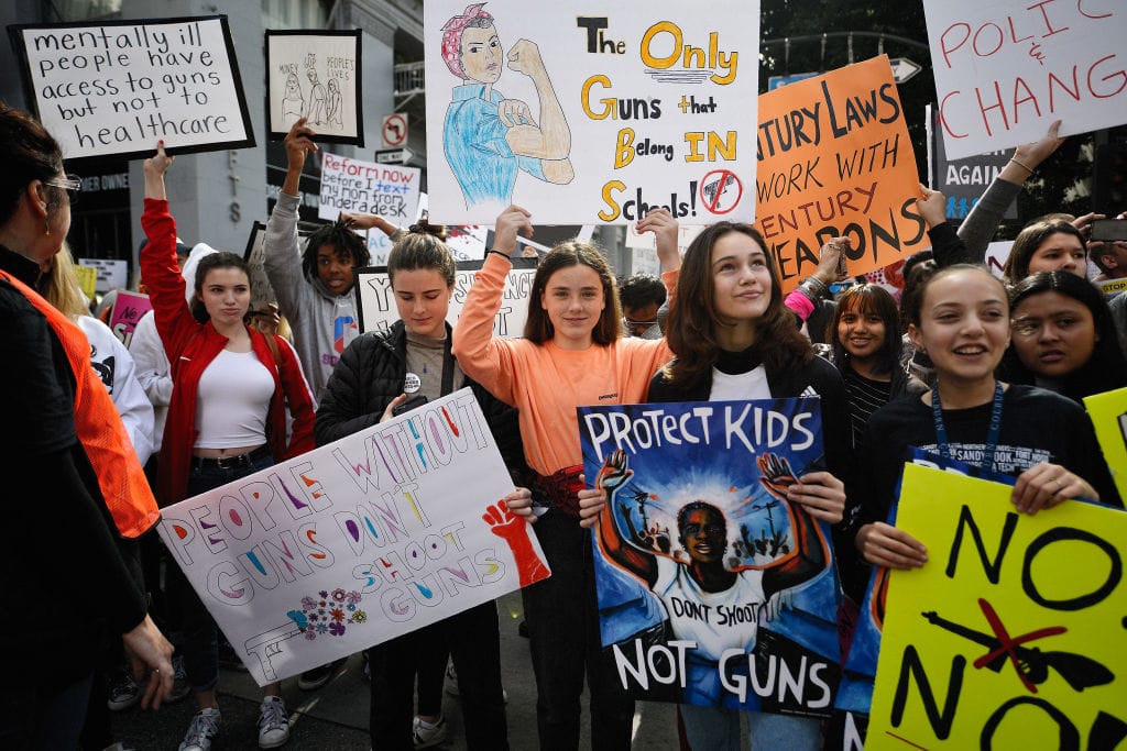 Students participate in a protest against gun violence during the National School Walkout in Los Angeles, California on April 20, 2018. Students and activists throughout the US marked the anniversary of the Columbine High School massacre and called for strict gun control laws. (Photo by Ronen Tivony/NurPhoto via Getty Images)