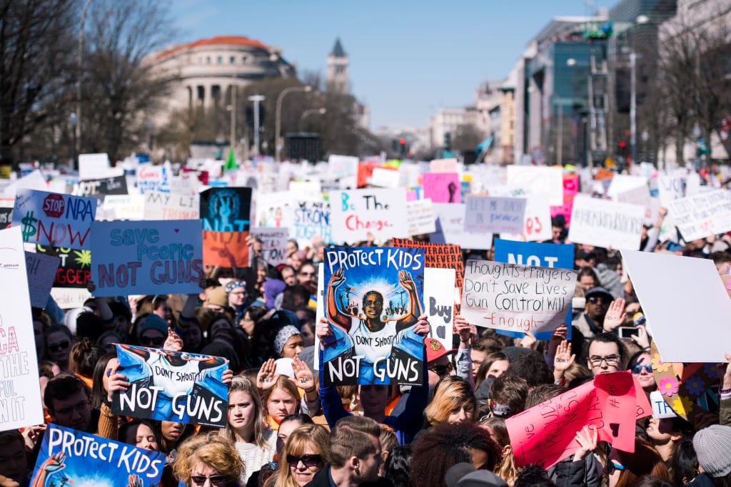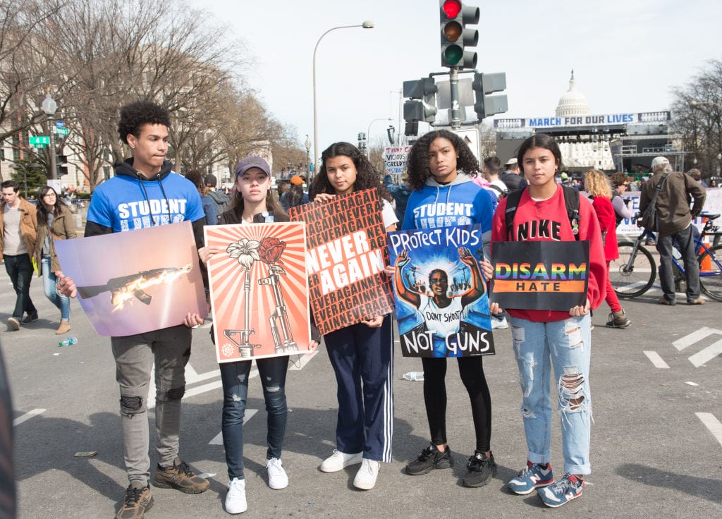 WASHINGTON, DC – MARCH 24: Protesters pose with signs during March For Our Lives on March 24, 2018 in Washington, DC. (Photo by Noam Galai/WireImage)
