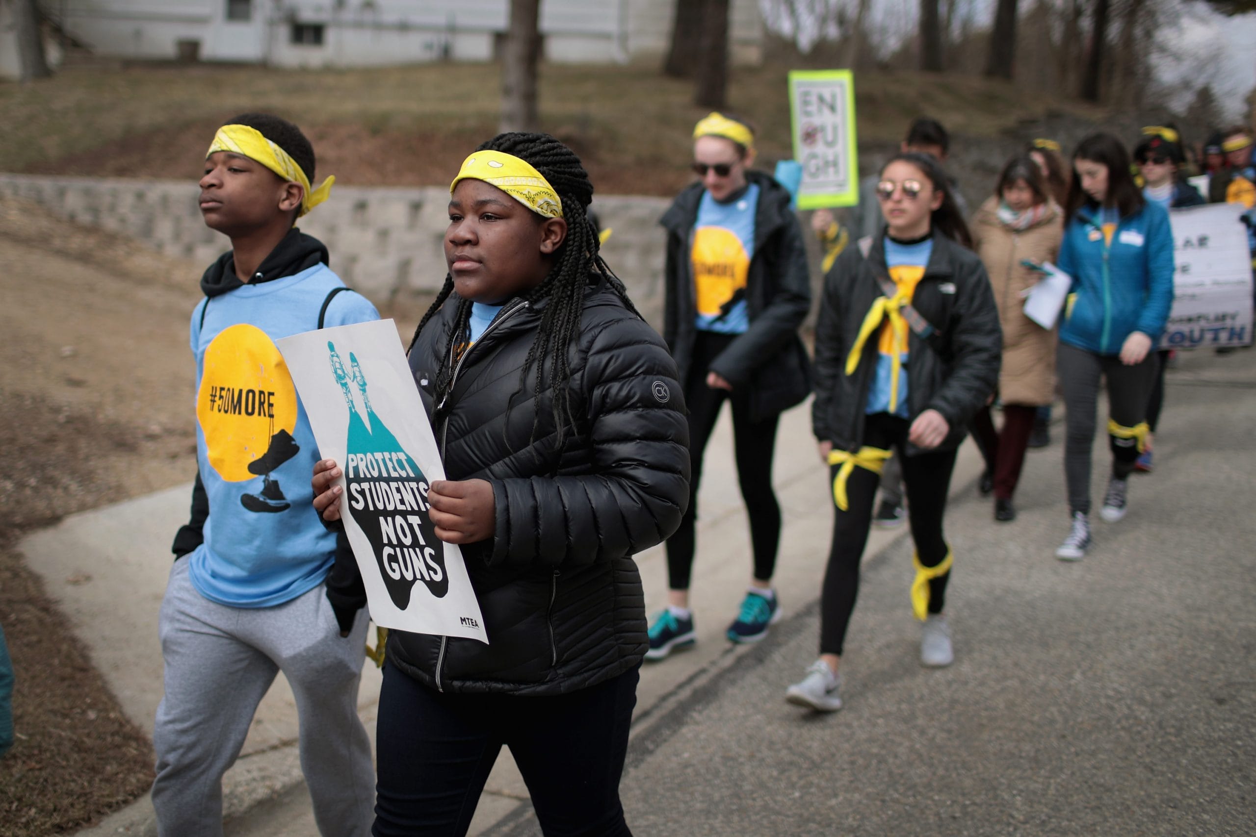 JANESVILLE, WI – MARCH 28: Students march the last leg of a 50-mile journey into the hometown of House Speaker Paul Ryan (R-WI) to call attention to gun violence on March 28, 2018 in Janesville, Wisconsin. About 40 students from around Wisconsin organized the march, dubbed 50 Miles More, to keep alive the spirit and dialog of the recent March For Our Lives events. (Photo by Scott Olson/Getty Images)