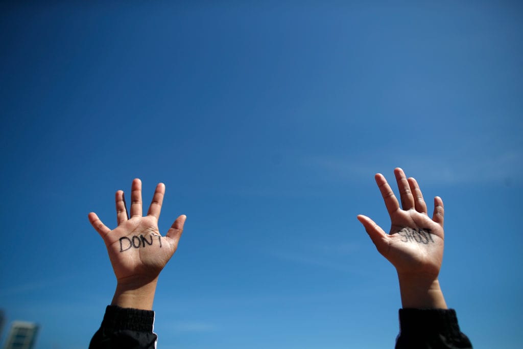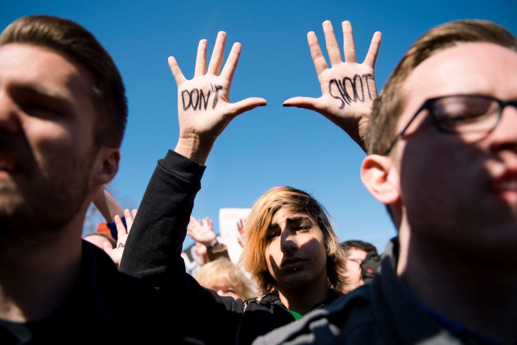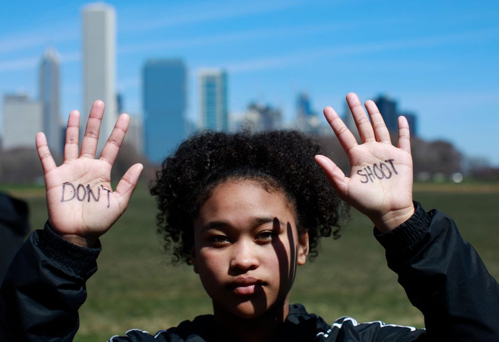 CHICAGO, IL – APRIL 20: A student holds up her hands while taking part in National School Walkout Day to protest school violence on April 20, 2018 in Chicago, Illinois. Students from around the nation joined in the walkout against gun violence on the 19th anniversary of the shooting at Columbine High School where 13 people were killed. (Photo by Jim Young/Getty Images)