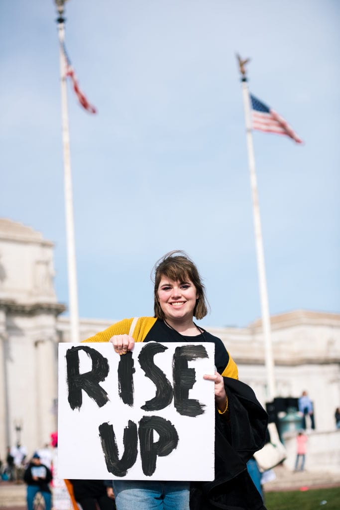 WASHINGTON DC, UNITED STATES – 2018/03/24: Young student holds Rise Up sign at March for our lives.