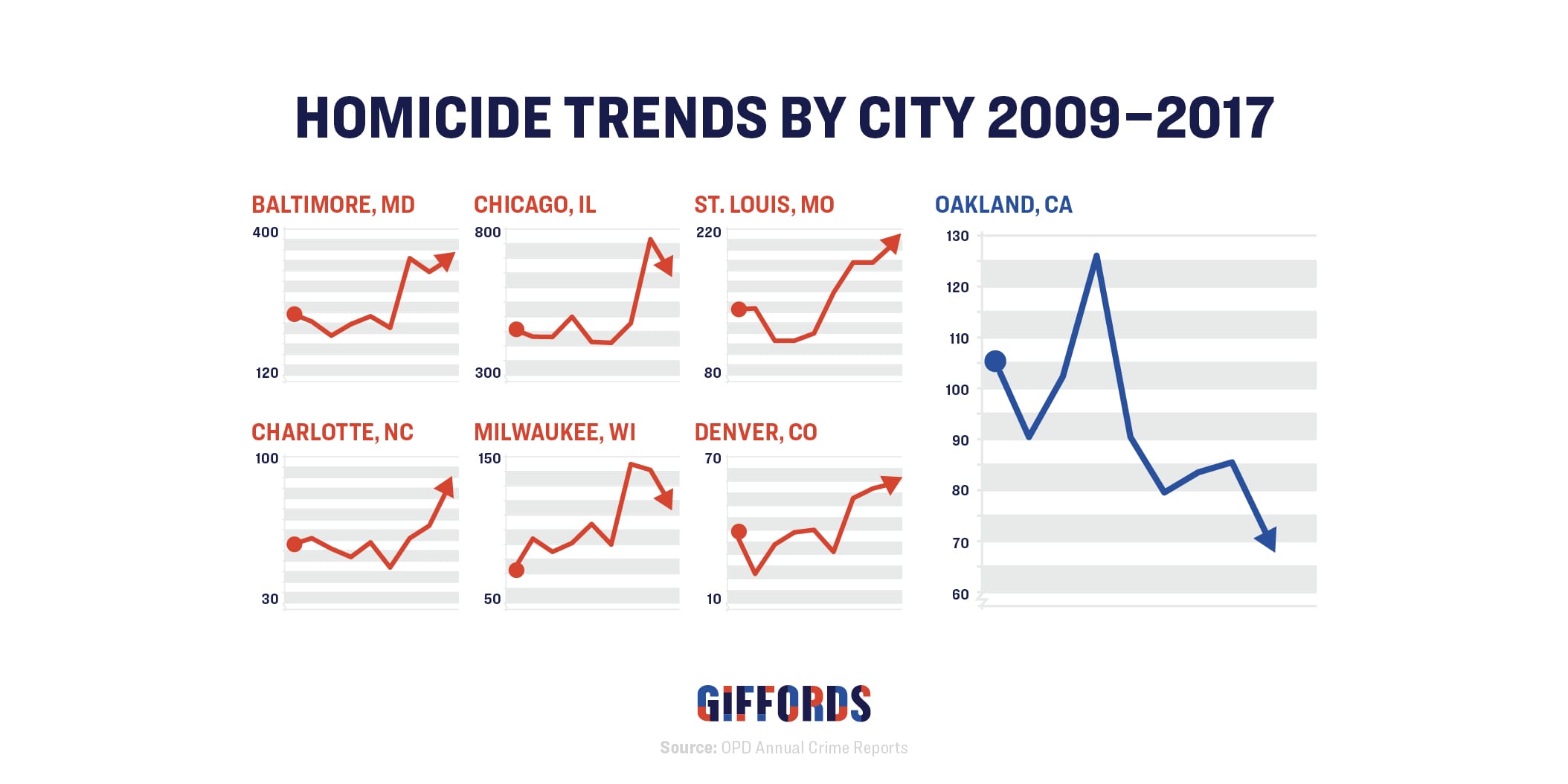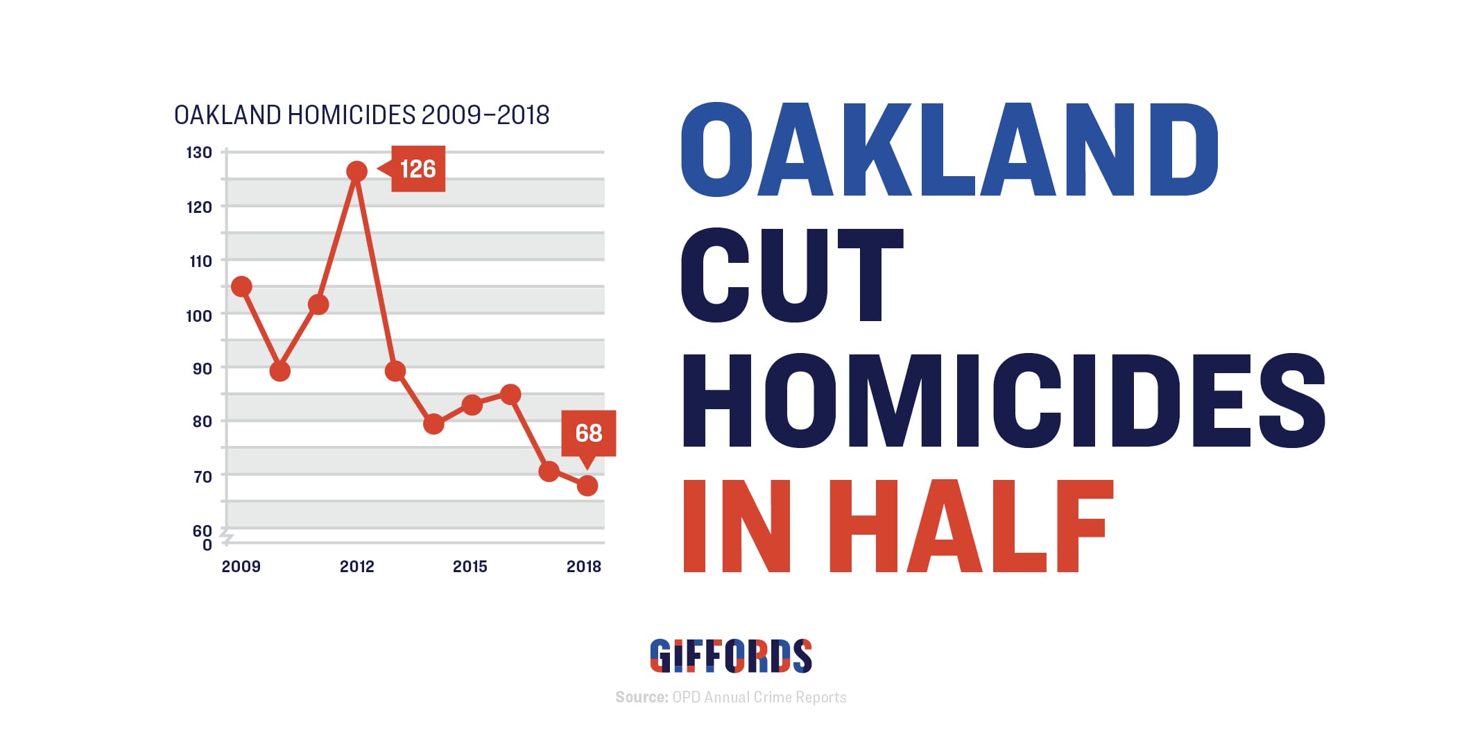 April 24, 2019 — As communities across the country look for ways to reduce gun violence, Giffords Law Center unveiled a new report, A Case Study in Hope: Lessons From Oakland’s Remarkable Reduction in Gun Violence , exploring the city’s successful citywide gun violence reduction strategy. Since 2012, Oakland has cut its annual shootings and homicides nearly in half. By 2018, Oakland recorded its lowest number of homicides in almost two decades. This stands in direct contrast to many other major American cities that saw an increase in gun violence after 2012.
