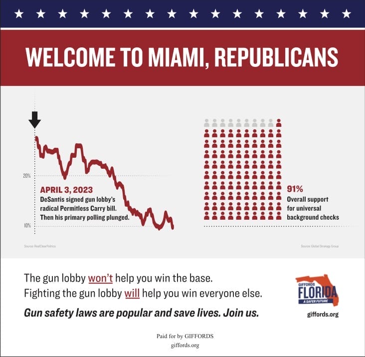 Washington DC — Today, GIFFORDS, the gun violence prevention organization founded by former Congresswoman Gabrielle Giffords, announced new digital and print ads ahead of the Republican debate in Miami. The ad, published today in the Miami Herald, uses Florida Governor Ron DeSantis’s failing campaign to show that Republicans can no longer rely on appeasing the gun lobby in attempt to shore up conservative support. DeSantis’s poll numbers have done nothing but fall since he cozied up to NRA lobbyists and signed dangerous permitless carry legislation into law.