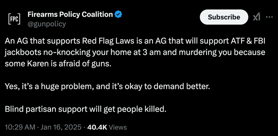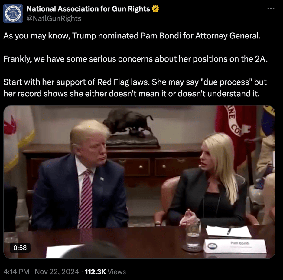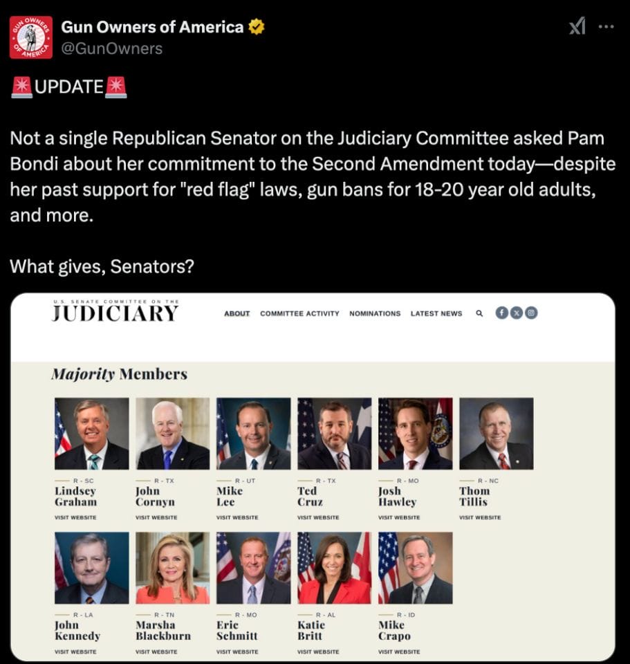 “For decades, the gun lobby had an iron grip on congressional Republicans, but times have changed. Judiciary Committee Republicans completely ignored the demands of the gun lobby to press Pam Bondi about her stances on popular gun violence reduction measures like red flag laws,” remarked GIFFORDS Executive Director Emma Brown. “Unanimously ignoring a frenzied gun lobby would’ve been unthinkable just a few years ago.”