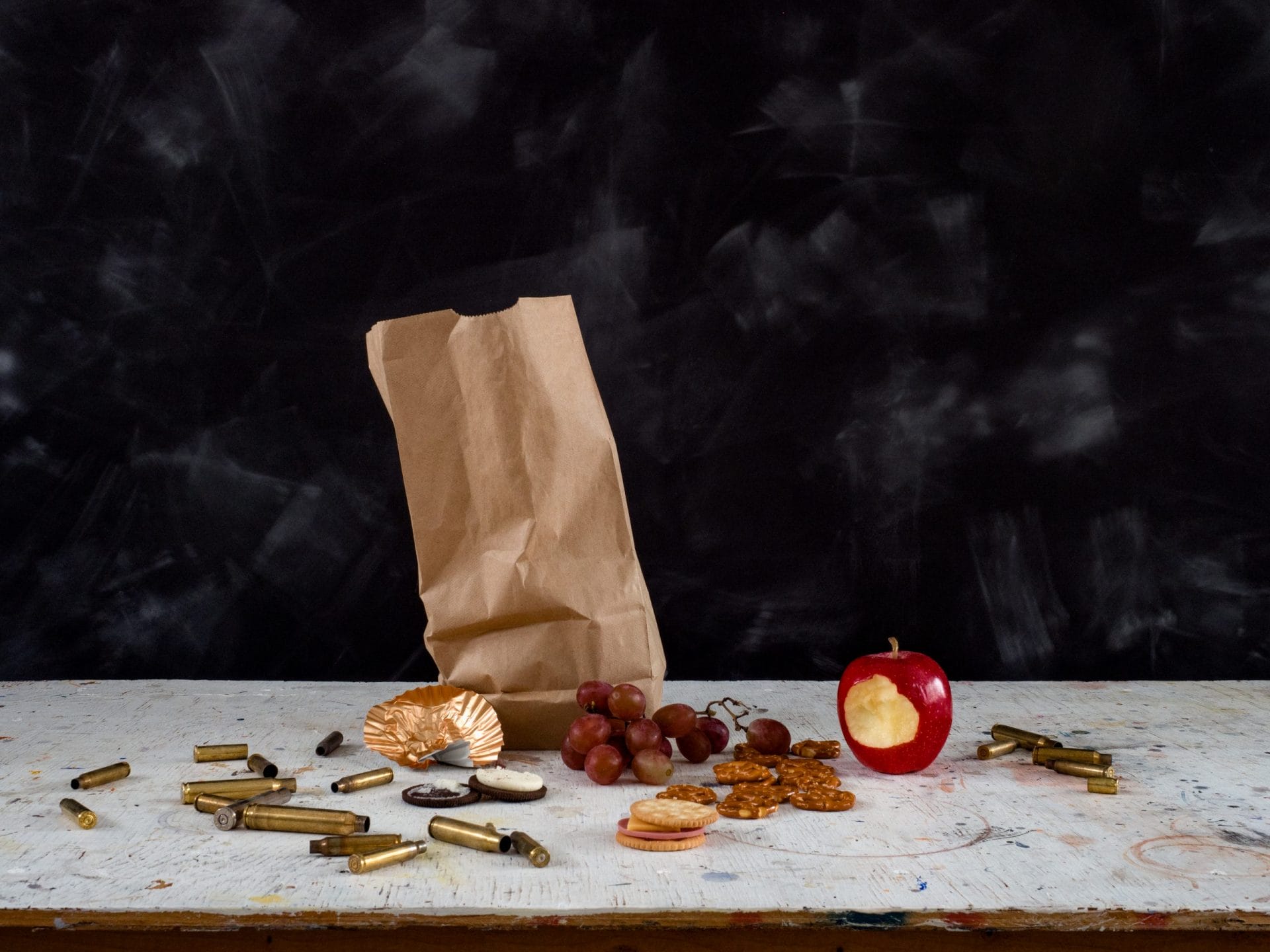 Because still life photography is often regarded as innocuous, it may seem like an unlikely medium for such a violent topic. However, my work derives its “shock factor” from the incongruities it entertains; my compositions are simple, spare, and even aesthetically appealing, but in such a quiet, visually serene environment, gun casings and other symbols of school shootings create a disturbing dissonance.